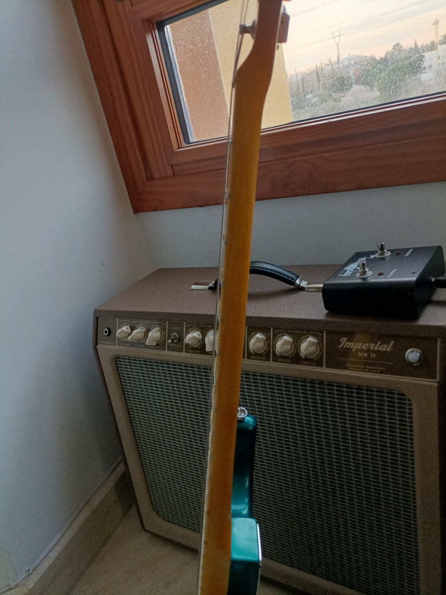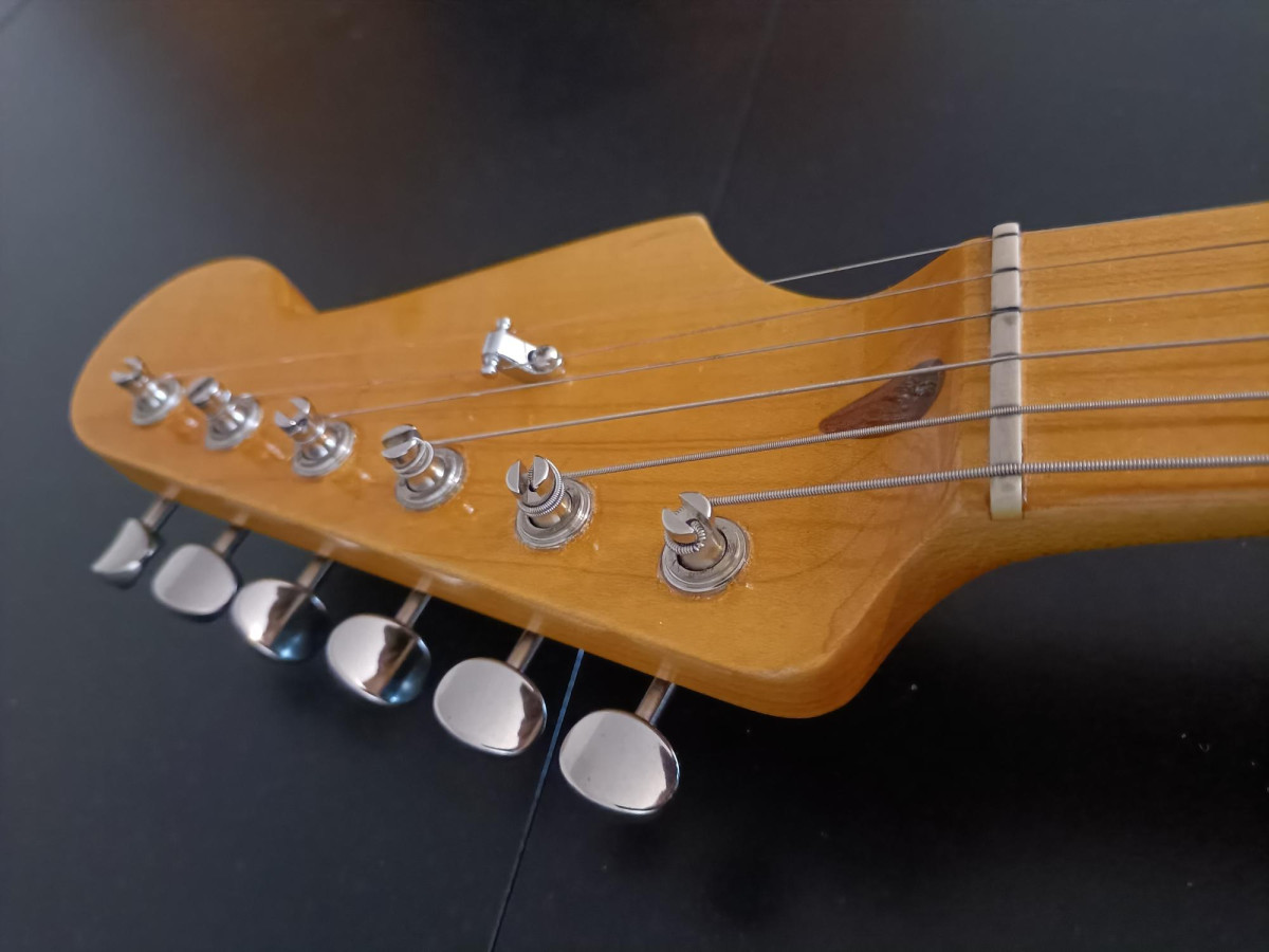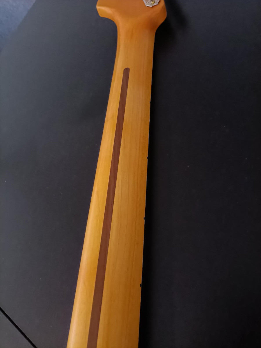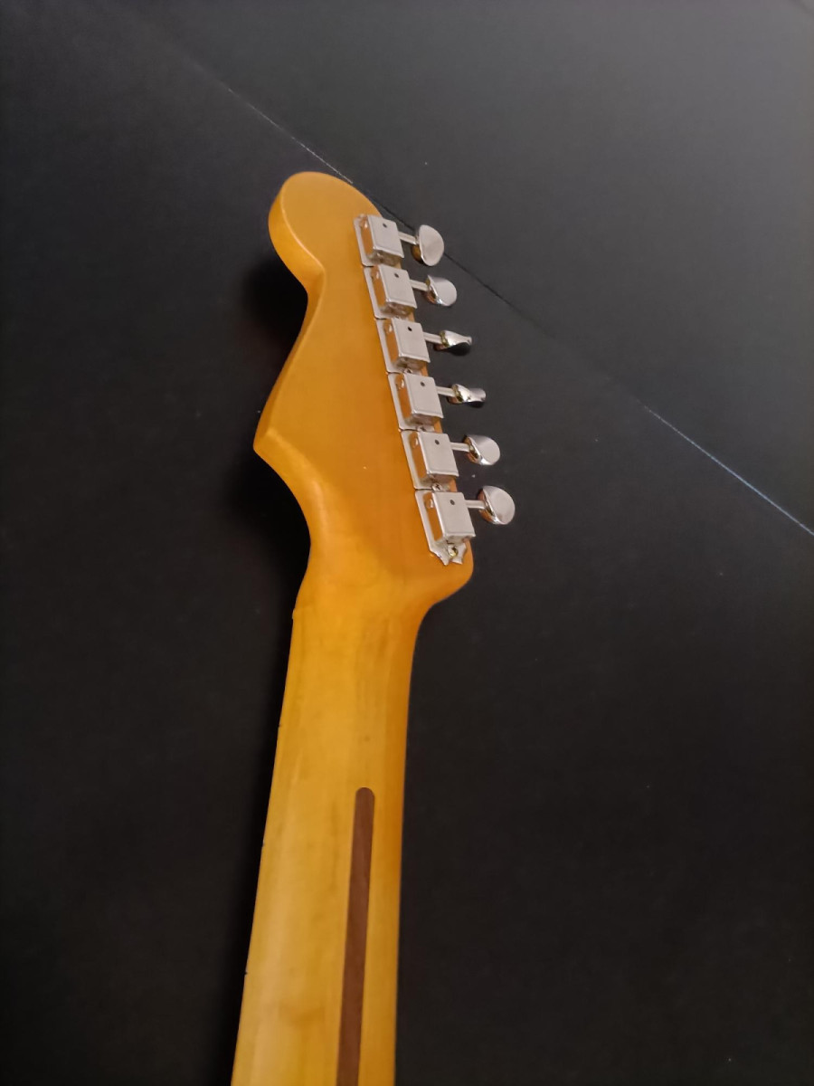 Mástil: Musikraft USA, arce de 1 pieza, bordes redondeados, radio 10", 22 trastes jumbo dunlop 6100, cejuela grap tech tusq, clavijero kluson vintage double line, acabado en nitrocelulosa amber vintage, trastes impecables, apenas usada.