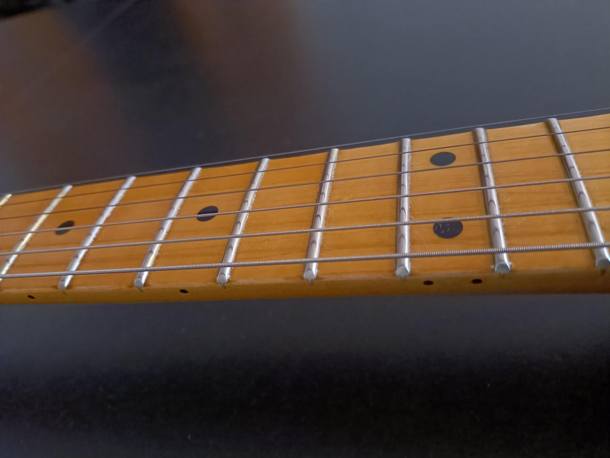 lleva cuerdas 10-46 pero parece que estás tocando con 9, muy blandita, ha sido perfectamente ajustada por luthier, la cejuela está muy bien tallada y pulida y las silletas hace que se sienta muy blanda, puedes hacer bendings de tono y medio a lo largo de todo el mástil sin que se apague el sonido.