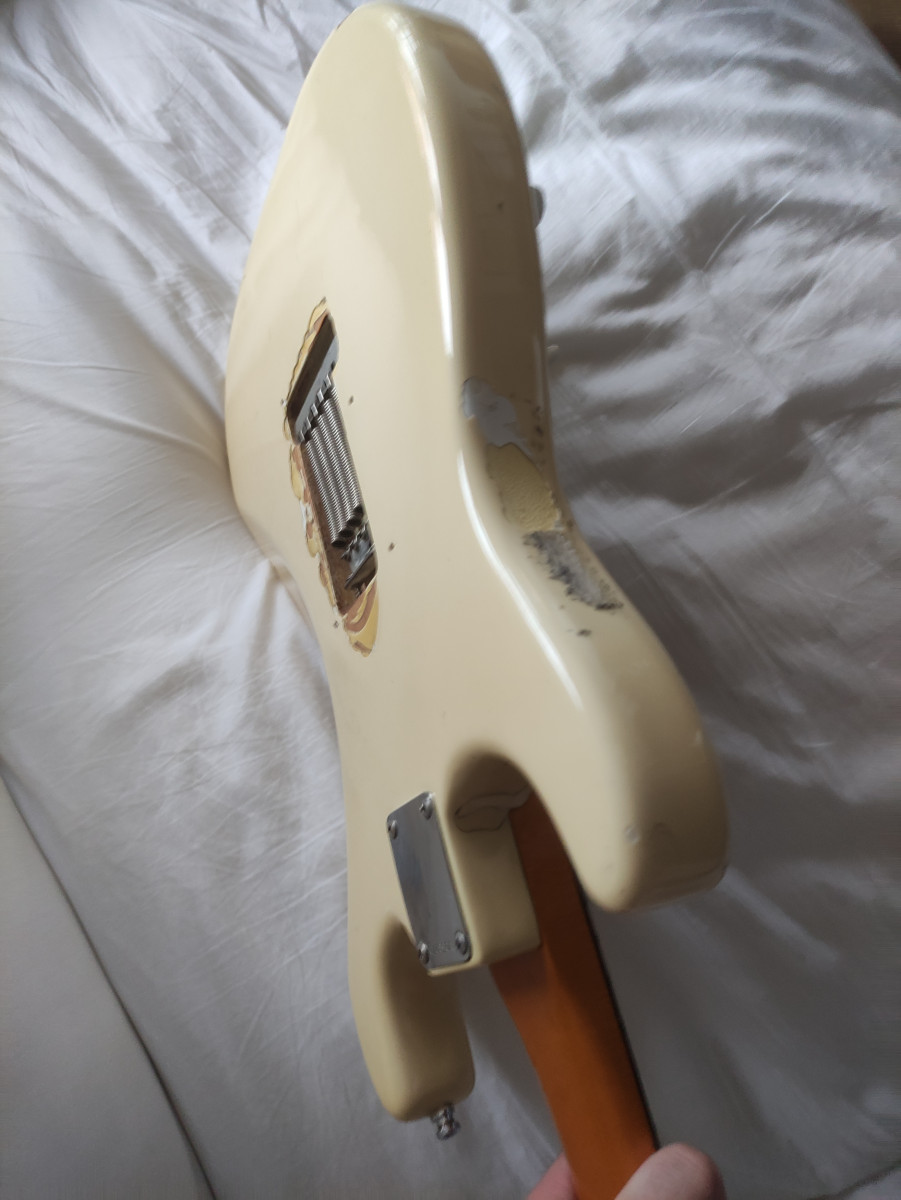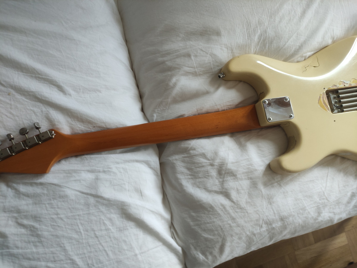 La guitarra suena increíblemente bien y es muy cómoda de tocar. No tiene funda. Mi amigo me la vendió con una funda sólida marrón que tenía más años que la polca y estaba hecha mierda. Me deshice de ella hace mucho tiempo. Si hay que enviarla la podría enviar en una funda sólida que tengo que tiene un cierre roto pero sobra para protegerla. Lo mejor para los interesados sería que la vieseis en persona. Cuando la compré era blanca color marfil. Ahora es mucho más oscura...supongo que los años no han pasado en balde. Algunos foreros me han dicho que seguramente está repintada. Si lo está, se hizo antes de que yo la comprase hace 32 años.