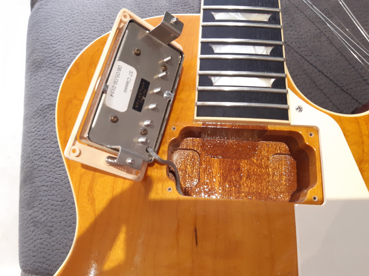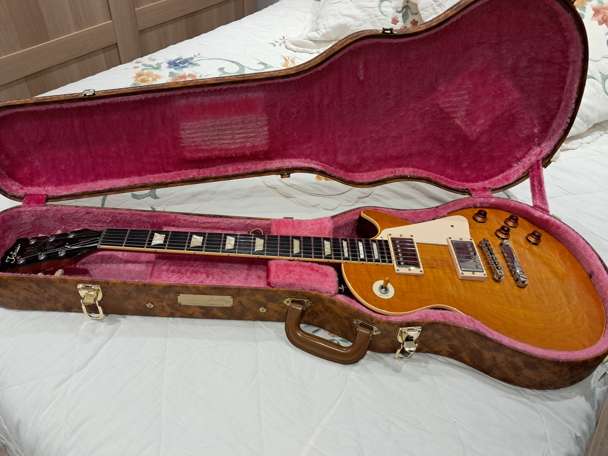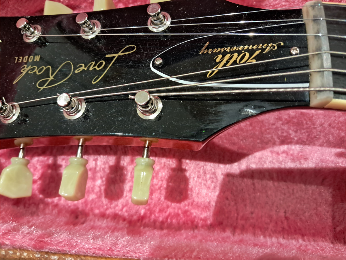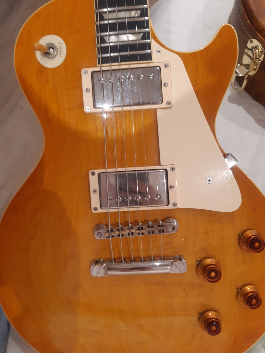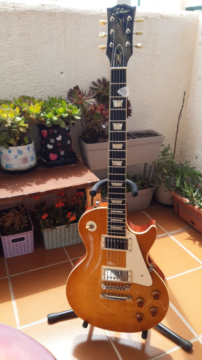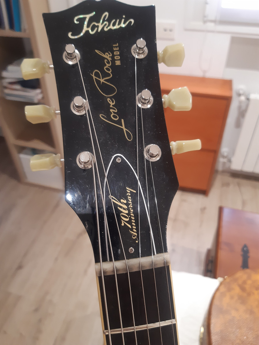 Vendo mi Tokay 70 aniversario. La guitarra está como nueva salvo una pequeña marca en pala (ver foto ampliada, ya la compré así pero es puramente estetico), y mejorada con unas Classic 57 (no es mérito mío, se las puso su anterior propietario) y con el estuche mas lujoso de Tokai. Es un guitarrón terminada en nitro, con cuerpo de una única pieza de caoba y dos piezas de arce norteamericano en la tapa, especialmente seleccionado para esta serie de solo 70 unidades para todo el mundo, y este es su acabado mas bonito a mi gusto, pero me juntado con dos Lespaul y para un muñón de dormitorio como yo, una tiene que salir y ésta es demasiado jamón para mi.