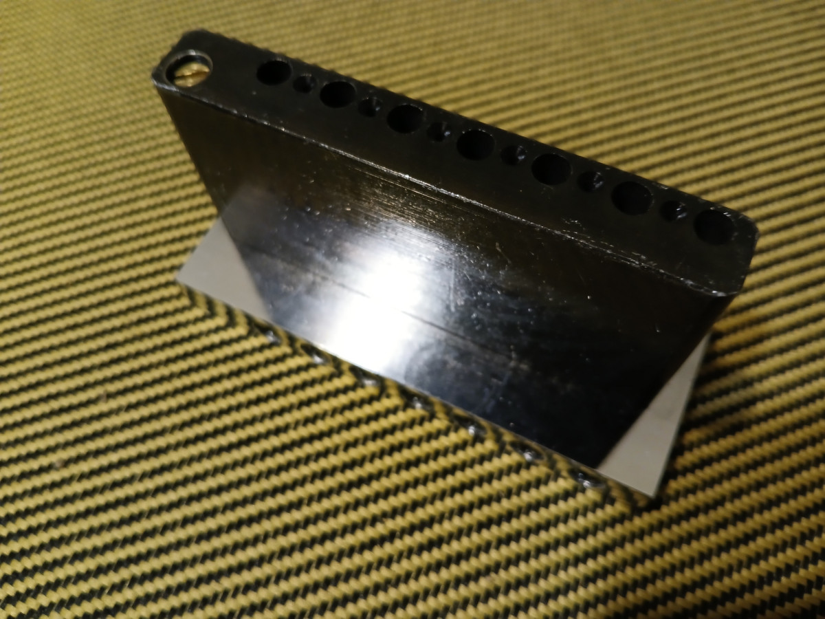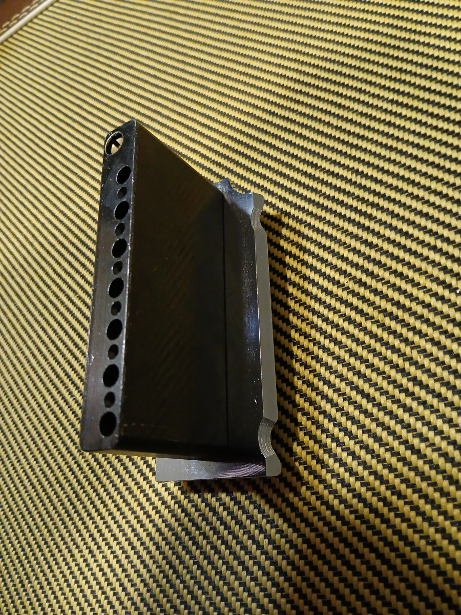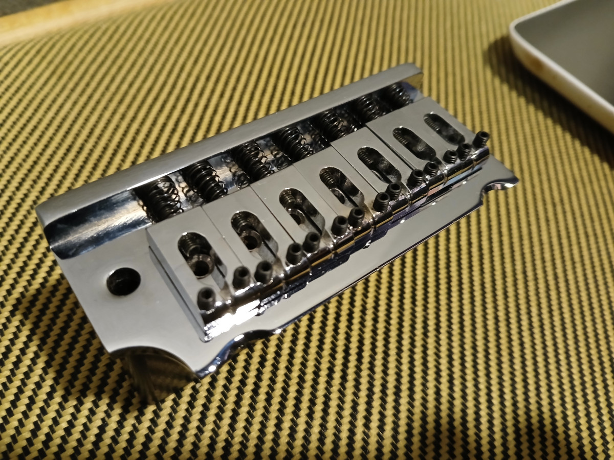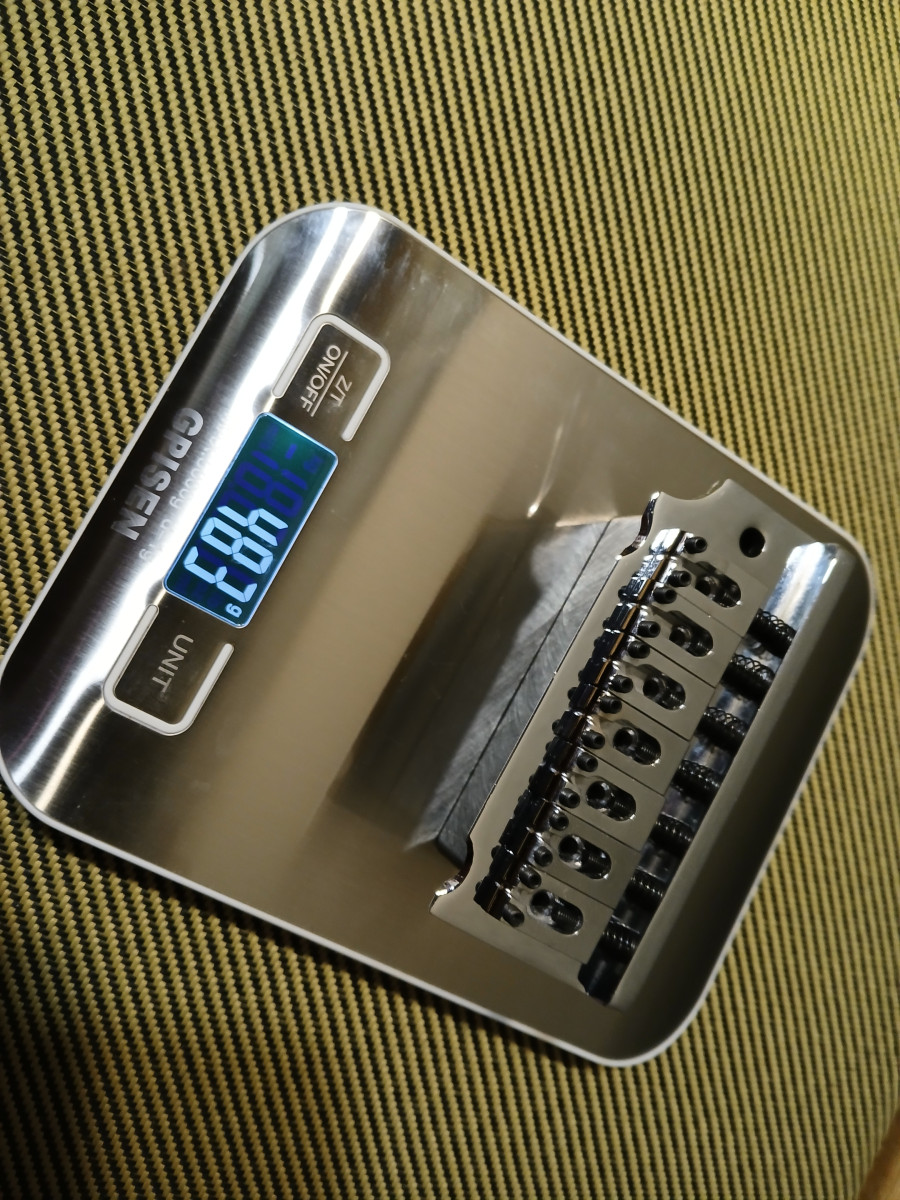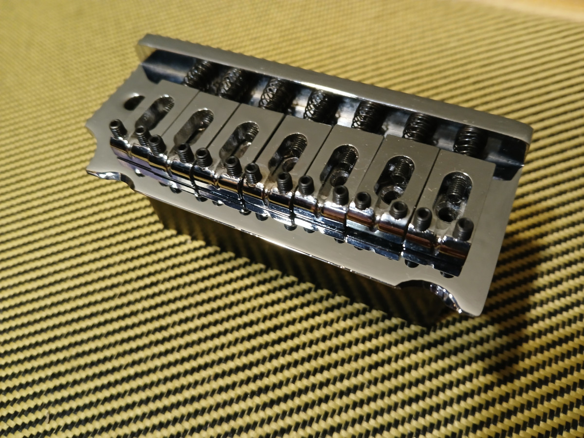Completamente nuevo, nunca usado. Puro acero. Pesa casi medio kilo. Para puentes con 2 puntos de apoyo. Distancia entre pernos y cuerdas, 6'5 cms. Largo: 9'8 cms. Ancho: 4 cms. Bloque incluido.