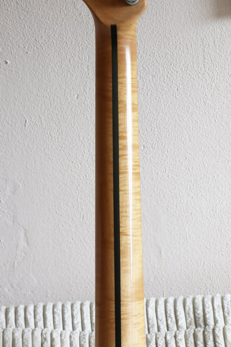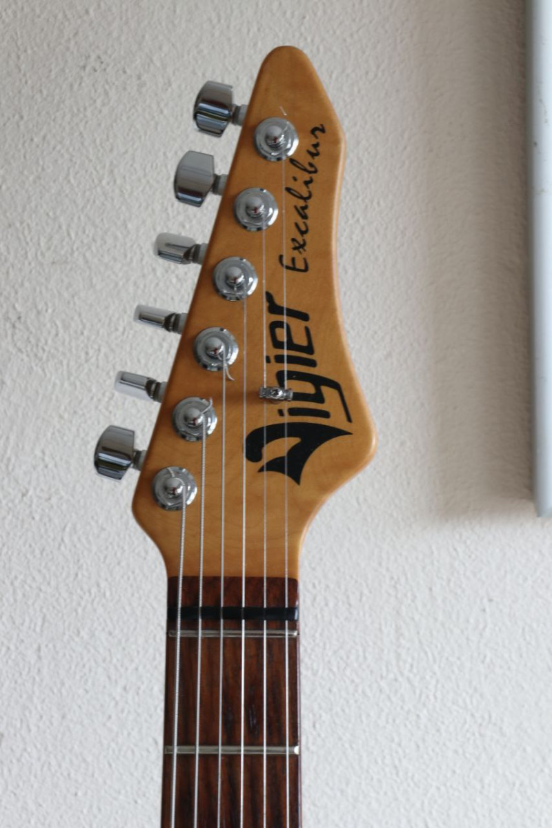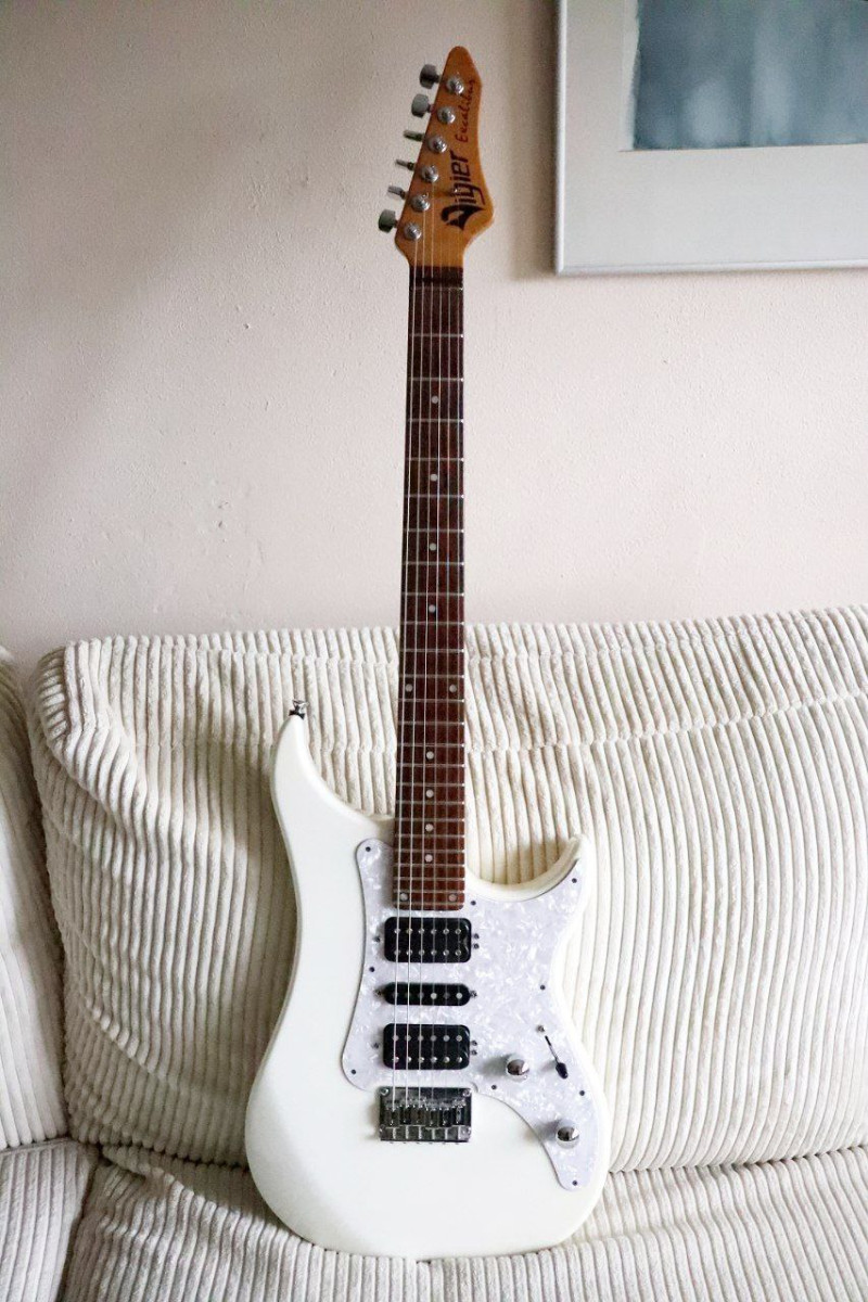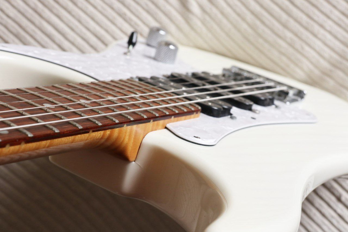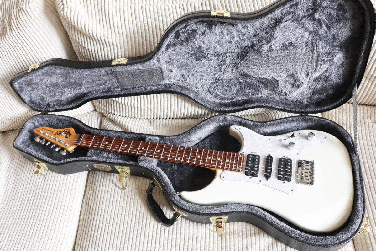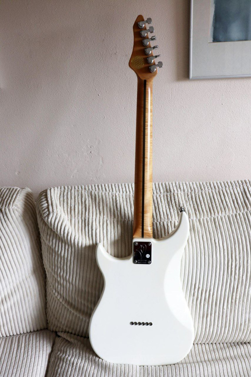 La guitarra está repintada en Blanco, con un trabajo tan fino que ni se distingue de uno de fábrica.