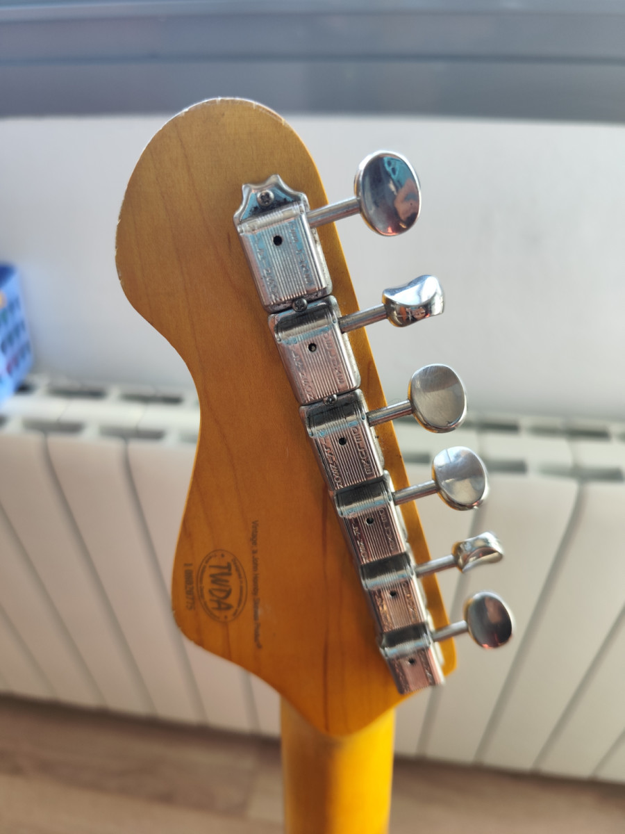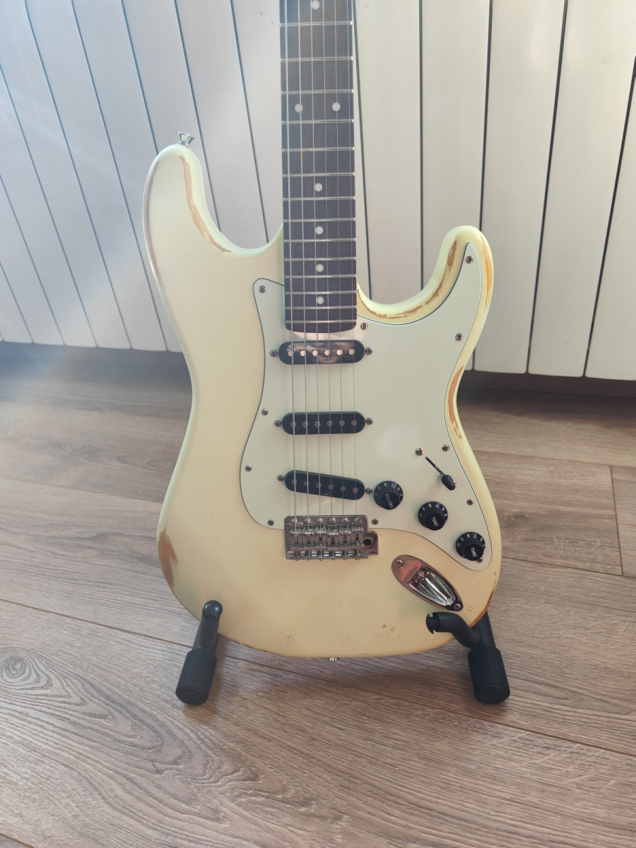 -Guitarra eléctrica estilo vintage en color blanco. Presenta un acabado relic que le da un carácter único.
