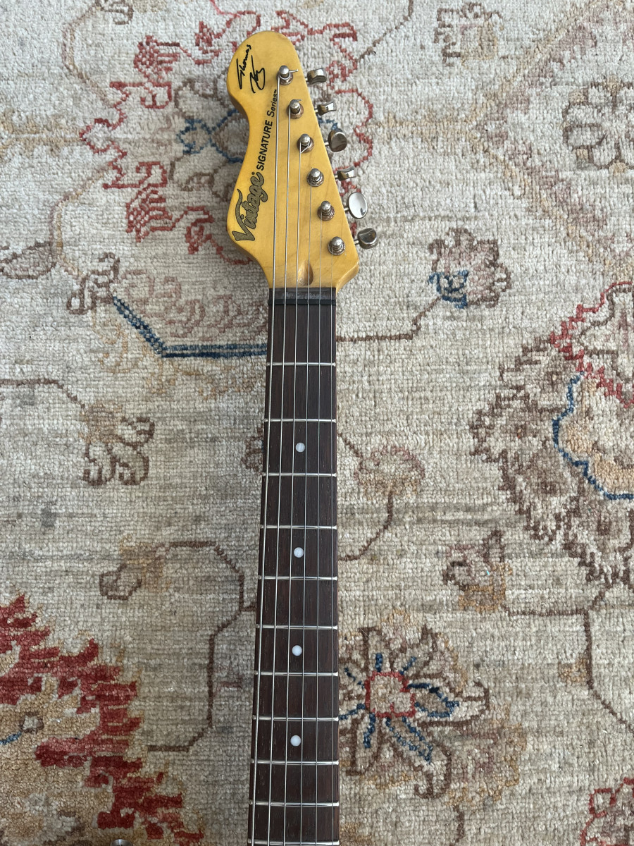 A la venta esta espectacular Stratocaster de la marca Vintage que monta un set de pastillas Q Pickups A5 Handwound (valoradas en 129 euros) que suenan a años luz de las pastillas originales (que también entrego junto a la guitarra). Es el modelo Signature de Thomas Blug “Summer of Love”