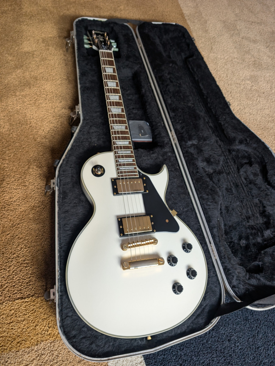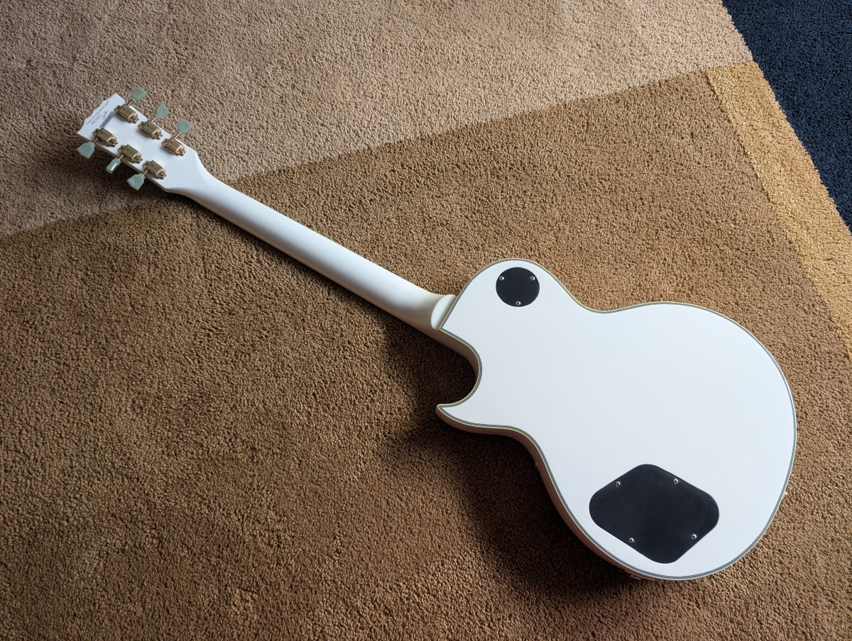 - Tapa del alma cambiada por una tipo Les Paul Custom. La original me parecía feísima. La incluyo pero si decides colocarla, quedarán a la vista los agujeros que hice para colocar la que lleva actualmente.