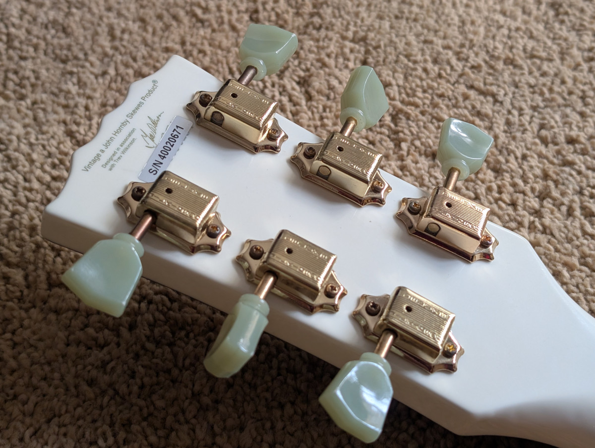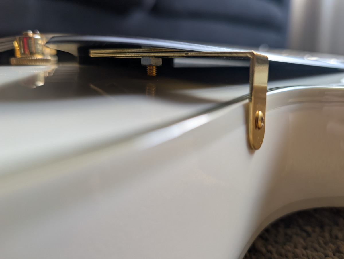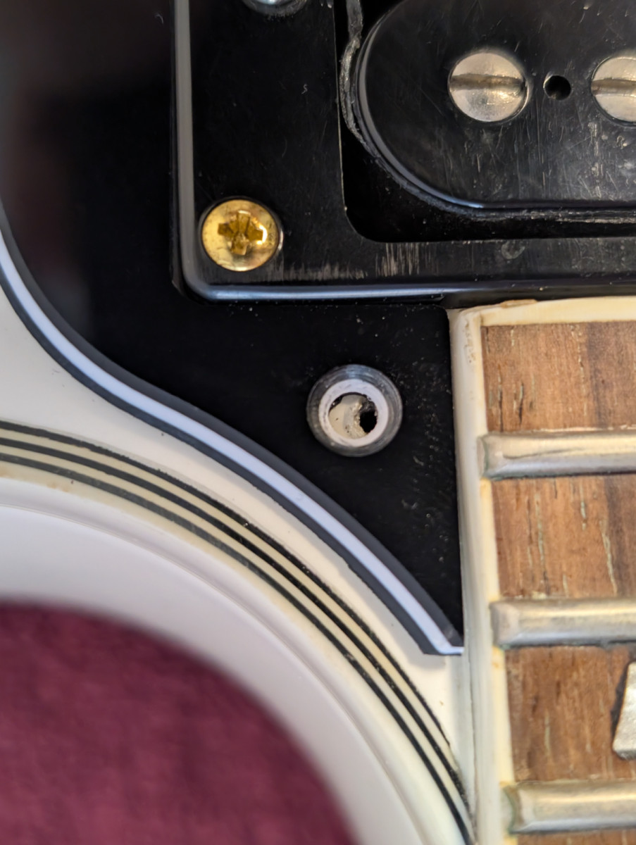 - Golpeador no original. Lo perdí. Compré uno que ajusta muy bien salvo por un ligero detalle: el agujero al lado de la pastilla del mástil no coincide al 100%. Por este motivo, le coloqué un tornillo negro muy pequeñito que evita tener que agrandar o hacer un nuevo agujero y sujeta el golpeador sin problemas. También incluyo un tornillo dorado por si se quiere hacer el agujero más grande. Yo no lo hice por si en un futuro se quiere dejar sin golpeador. Lo más importante es que el tornillo que sujeta el nuevo golpeador a la placa metálica que a su vez va a tornillada al cuerpo no roza la tapa para nada, por lo que no dejará marca. Ver fotos.