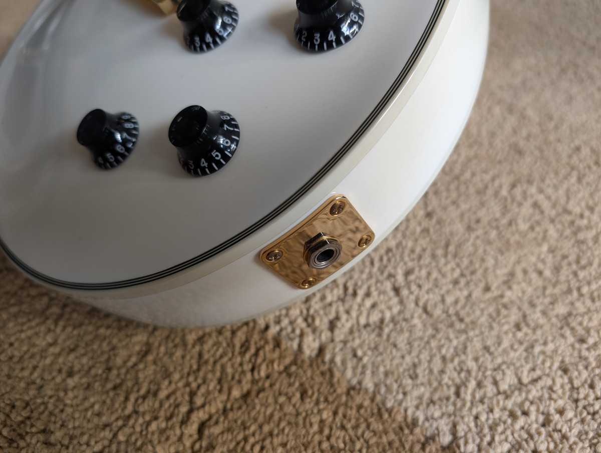 - Placa del jack metálica en dorado. La original era negra de plástico y se agrietó a los pocos años.