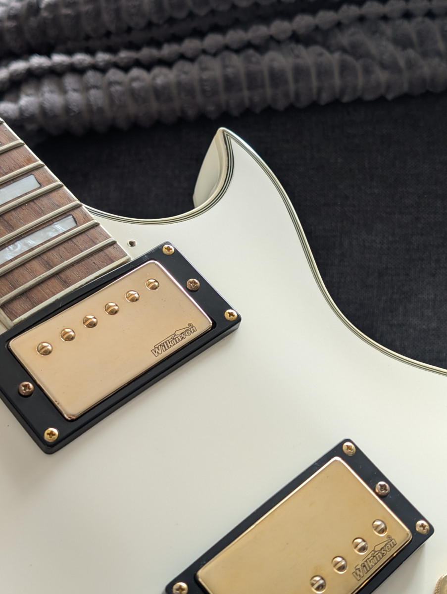 La guitarra va con las pastillas y herrajes Wilkinson originales y los potenciómetros de serie en cableado tipo 50s. El puente es tipo ABR-1 como en algunas Gibson Les Paul.