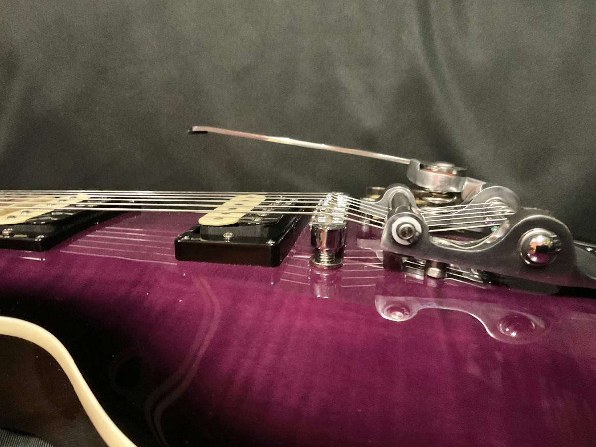 La guitarra la compré por capricho a Richards Guitars en UK en 2024 y no había manera de hacer que el bigsby no se fuera de madre.