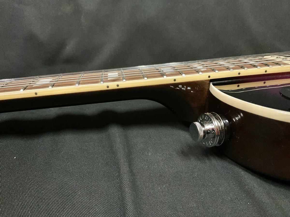 La llevé al luthier Juan Brieva aquí en Madrid y ahora es otra cosa, le puedes dar toda la caña que quieras al bigsby que aguanta la afinación. Le cambio los clavijeros, la cejuela, elevó la barra del bigsby como se ve en las fotos par reducir el ángulo de corte de las cuerdas en el puente y ahora es una maravilla.