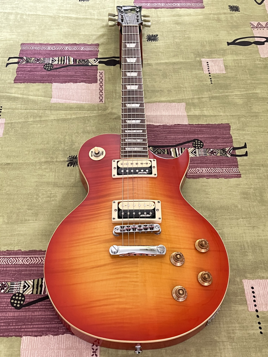 Cuerpo de caoba maciza con tapa de arce flameado y un precioso binding. Mástil encolado de caoba con escala Gibson (629mm/24,75"), perfil "soft C" y diapasón de Palisandro o Lignum Rosa (varía según la fuente consultada) con radio 12" y 22 trastes de perfil medio.