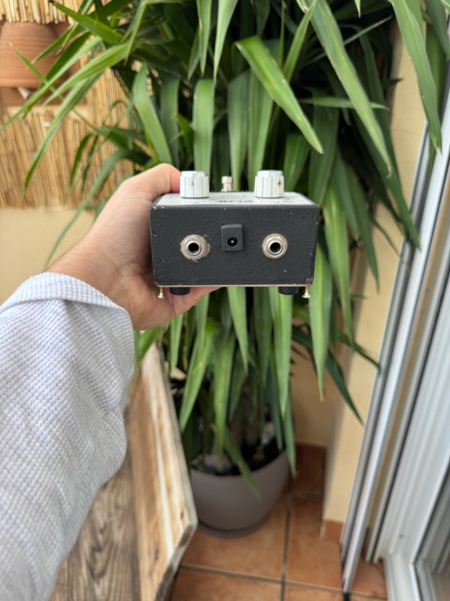 Ésta unidad en concreto ha sido restaurada por Don Poniz, que le sustituyó el switch (ya estaba viejo) y le añadió unos potenciometros de Farfisa muy molones).Incluyo los originales también. Cabe decir que esta unidad tambien tiene la entrada de 9v para que le puedas enchufar a tu fuente de alimentacion e integrar con tus pedales sin problema.