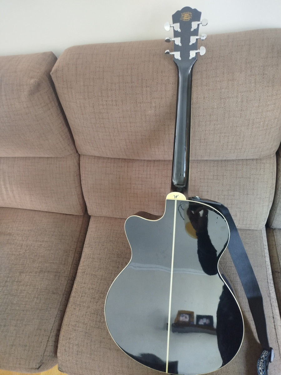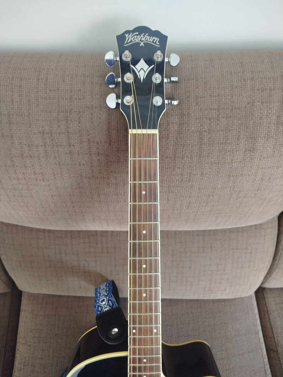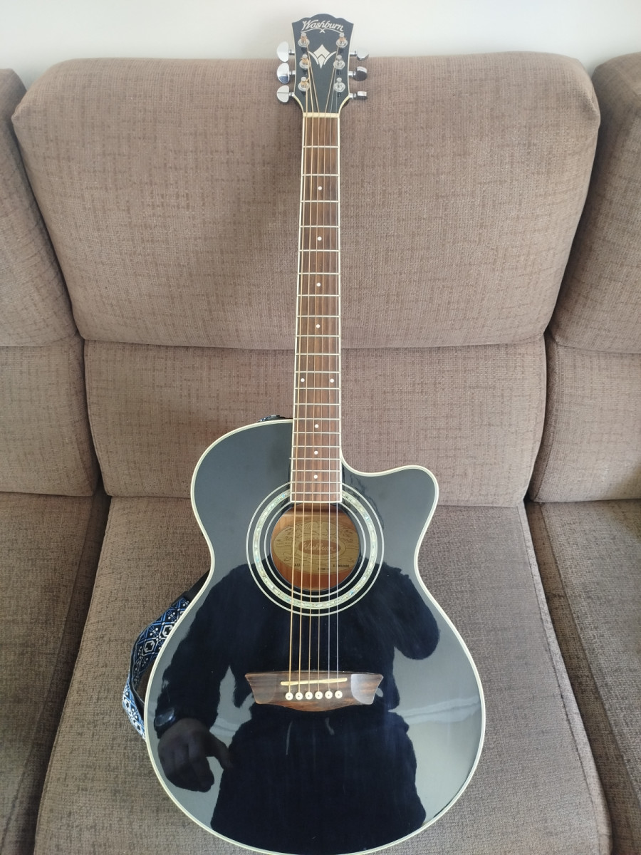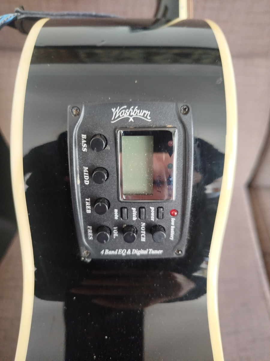 Se vende guitarra electroacústica Washburn EA12B mini jumbo en color negro, fabricada en tilo americano y diapasón de Palorosa con premplificador Barcus-Berry EQ4T con afinador incorporado.