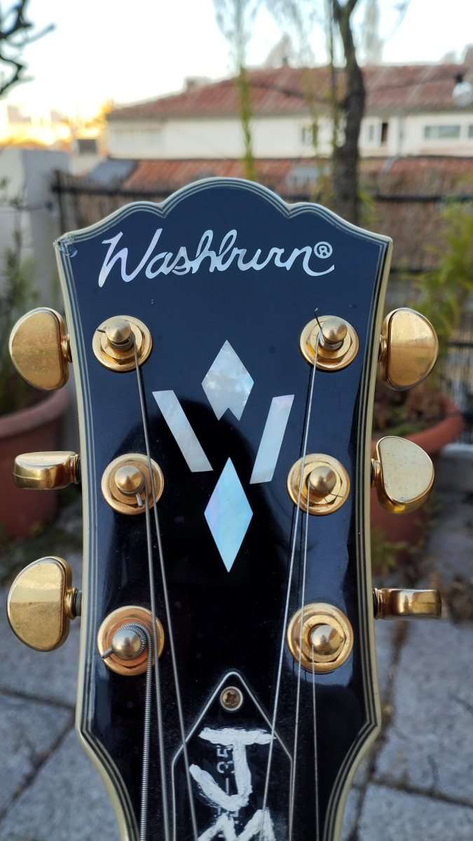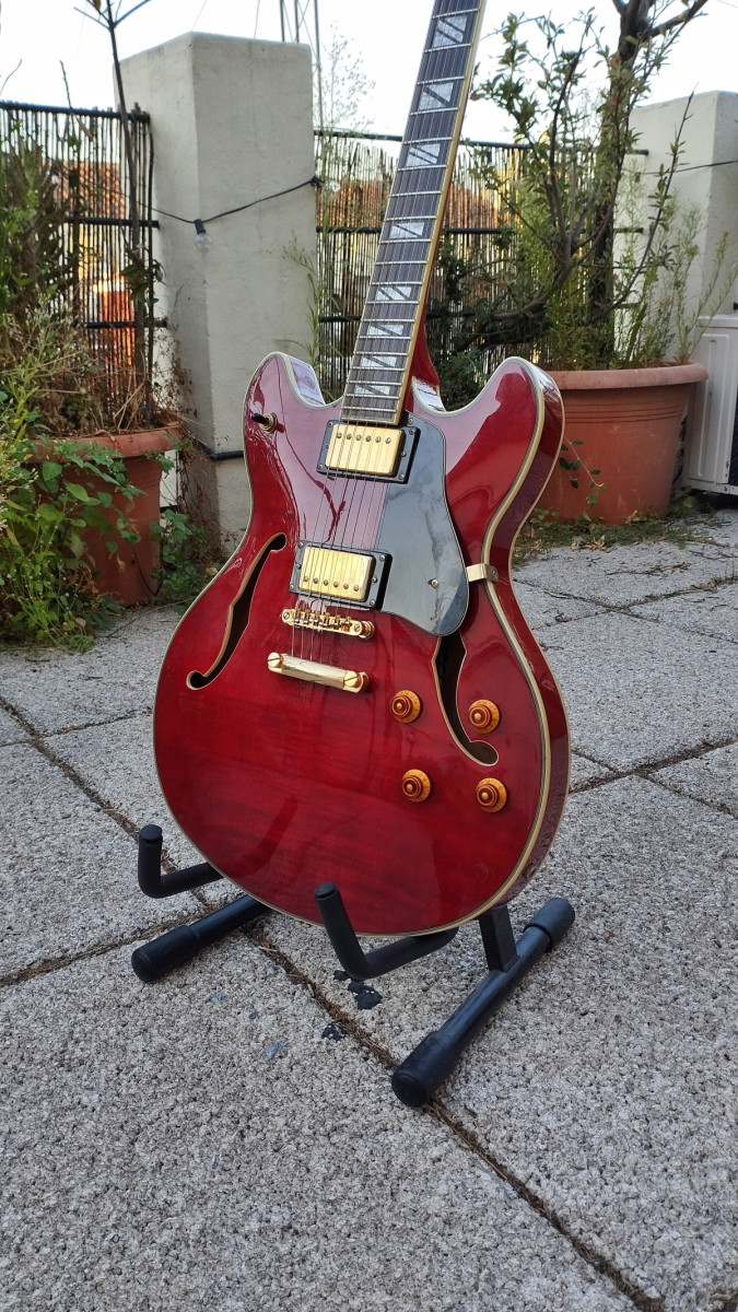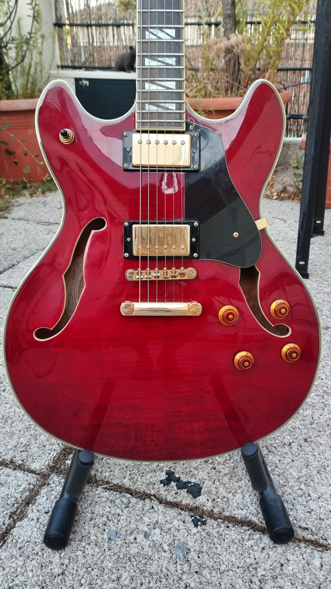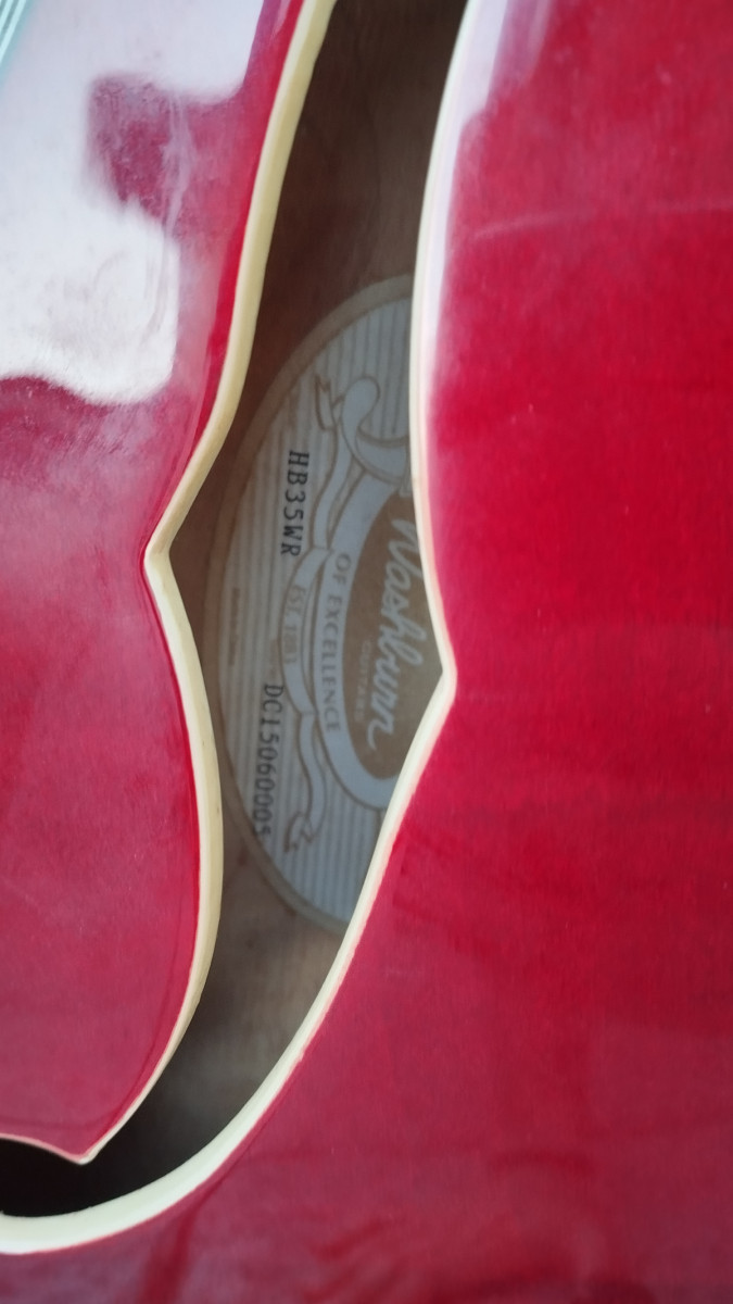 Preciosa Washburn HB35WR, guitarra eléctrica de caja semihueca. Color Wine Red inspirada en la mítica Gibson ES-335