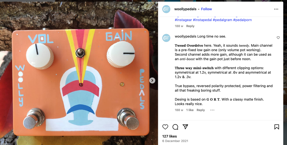 Overdrive boutique hecho por Woolly Pedals. La verdad es que no pensé que lo vendería nunca - me encantan los pedales simples, que suenan bien, están bien hechos y encima bonitos. Pero lo tengo que vender por un cambio de circunstancias.
