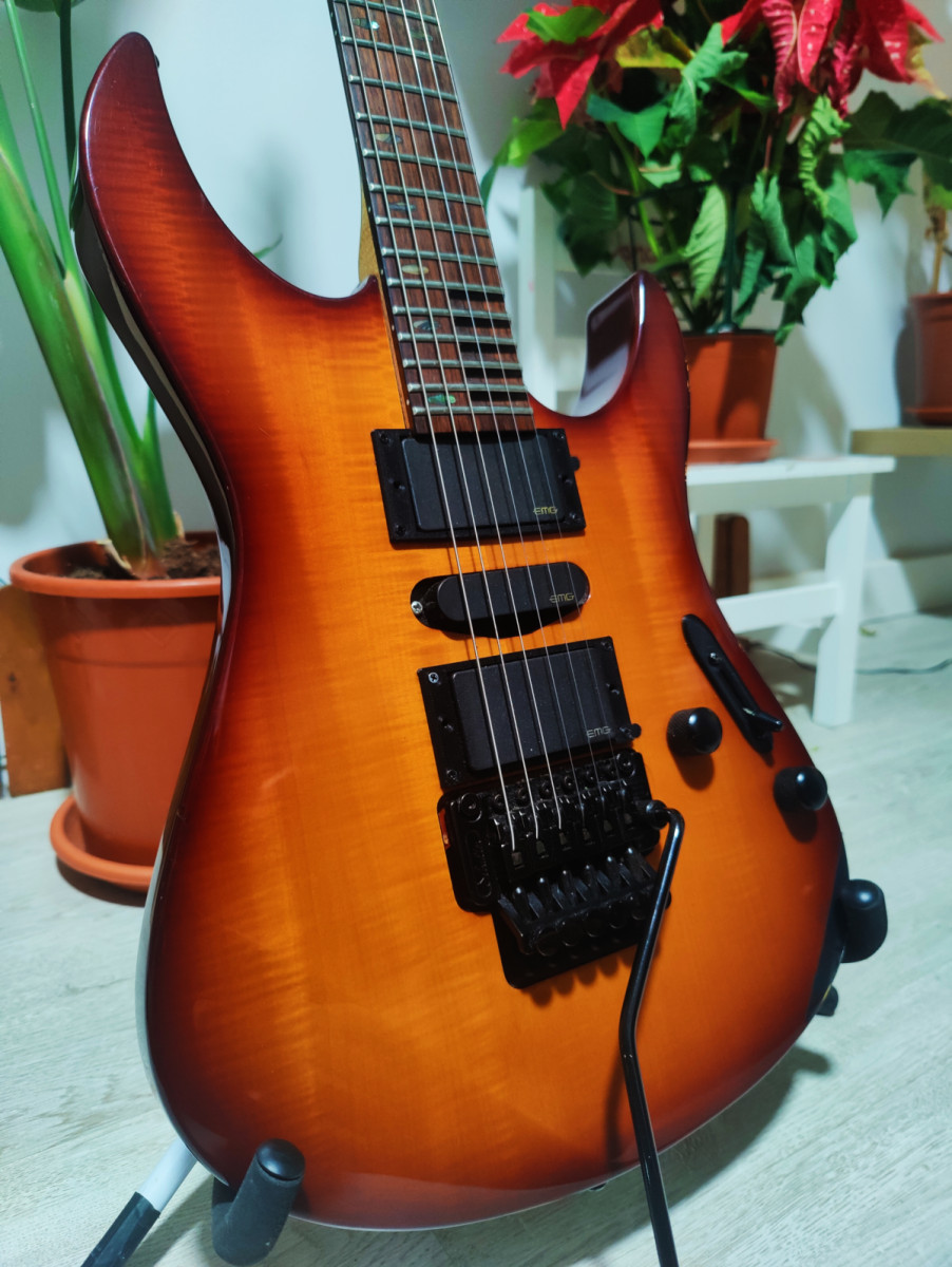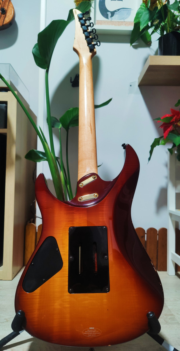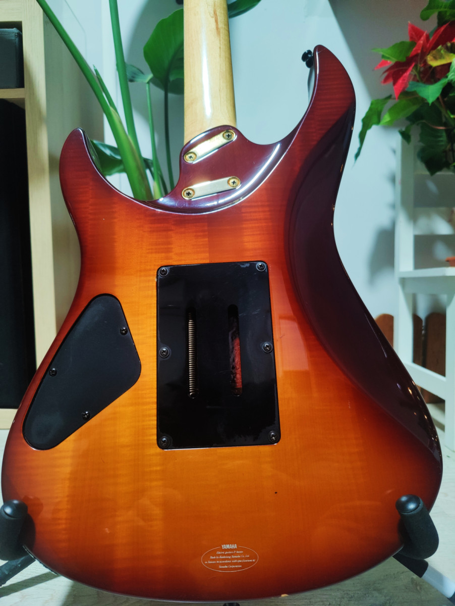 Guitarra eléctrica Yamaha RGX 821d, cuerpo de Aliso con veneer flemeado por delante y por detras, mastil de arce, diapasón palorosa con escalopado de serie en trastes agudos. Mástil súper cómodo 19.00mm en cejuela y 21.70mm en traste 12. Electrónica EMG pasiva con electrónica solderless (incluido el selector) puente Floyd Rose schaller Aleman.