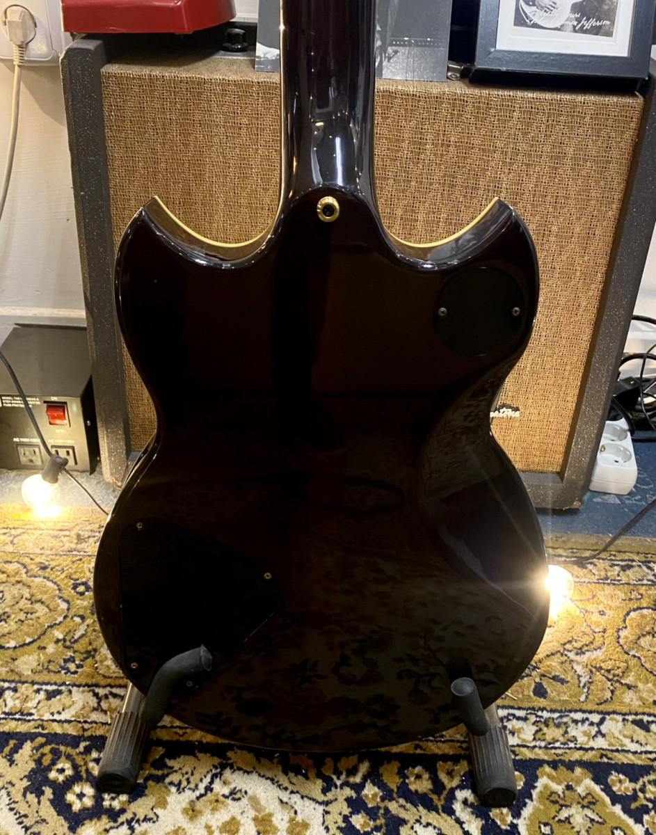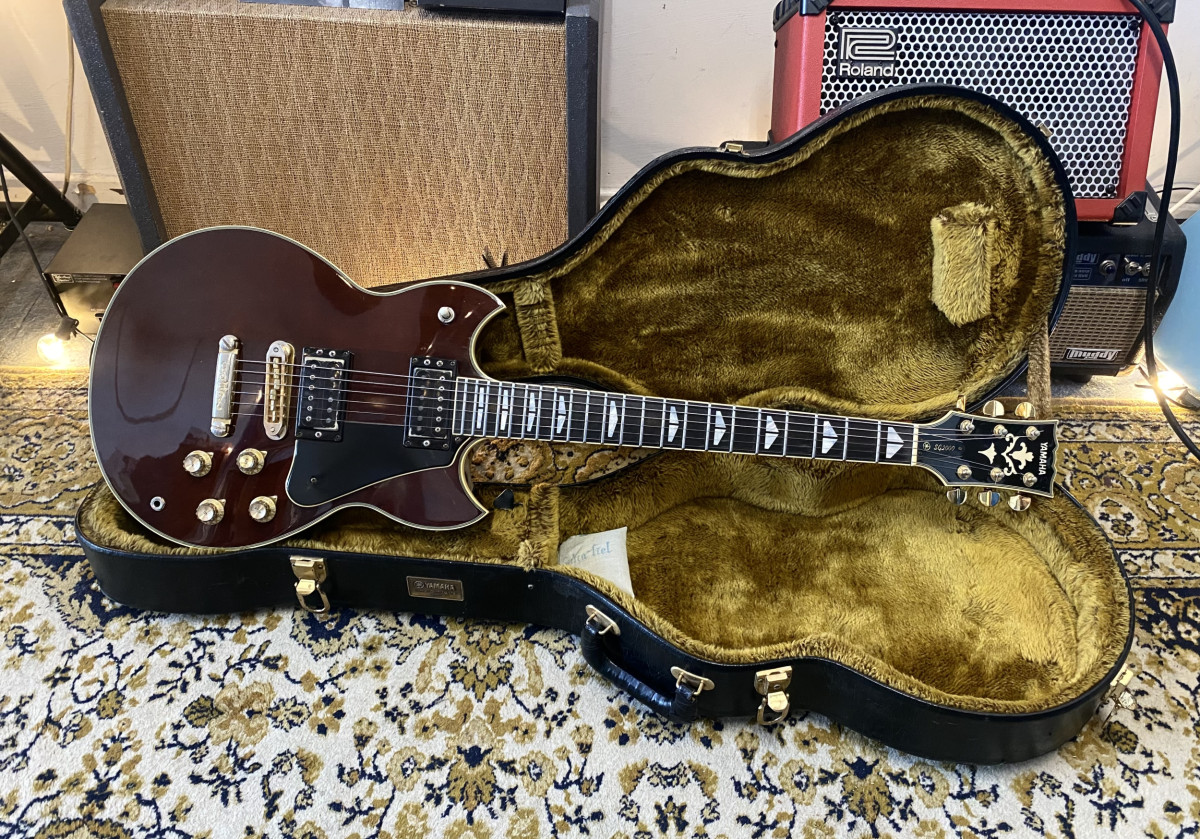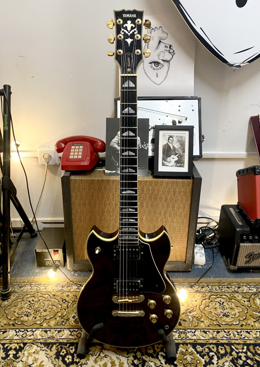 Vendo esta espectacular Yamaha SG2000 de 1978. La guitarra de Santana. Está en un estado excepcional para sus casi 50 años. Toda original excepto los trastes ya que se retrasteó con trastes de acero inoxidable. Incluido estuche original y correa de seguridad. Cuerpo de Caoba con tapa de arce tallada Mastil T-Cross atravesando el cuerpo. Diapasón de ébano muy oscuro con incustraciones Split Wing en madreperla. Puente Yamaha T-O-M con ribeteado. Pastillas dobles Alnico V. 22 trastes Escala 629 mm. Ancho de cejilla 42,86 mm. Tiene un sustain espectacular. Es un guitarrón. 2500€. Para envíos consultar. A toda prueba en mi estudio en Madrid. NADA DE CAMBIOS.