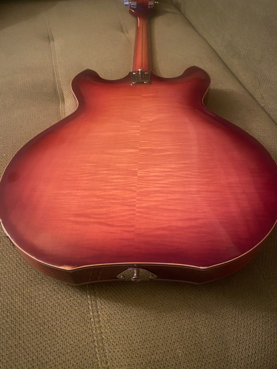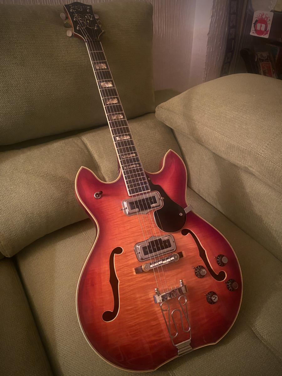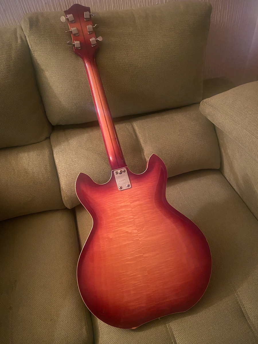 oferta 700e...Vendo por no tocar ya. Creo que es la ZeroSette thinline mas bonita que construyo este Luthier, que sin escatimar en detalles cuando la construyo instalo 2 pickups "Fender Coronado" de la epoca... Se juega sin ningun problema y su estado pienso es perfecto para sus 60 años, algunos pequeños saltados y tipicas fisuras en el barniz (ver fotos) pero nada importante que reseñar. Con su estuche original de gran calidad. No envío lo siento. Prefiero trato en mano, me da mieditis enviar guitarras, a toda prueba en madrid. Un saludillo.