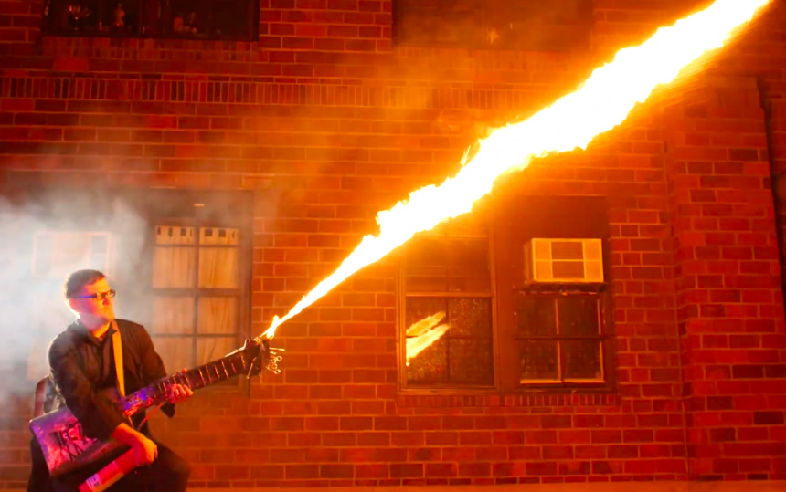 Claramente inspirados por Mad Max: Fury Road, la ultima película de la famosa saga post-apocalíptica y su escena de la guitarra lanzallamas, los responsables de los canales de YouTube Marty Music (de Marty Schwartz) y How to Make Everything (especializado en DIY), han colaborado para construir una guitarra exclusivamente hecha con partes de coches que han encontrado en un desguace. En realidad todo el peso de la fabricación ha corrido a cargo del 2º, que como no sabe tocar la guitarra ha tenido el asesoramiento de Marty.