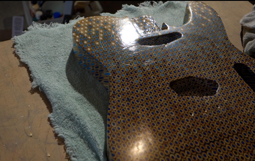 También había pensado en usar la resina epoxi como lacado, pero se dio cuenta de que por mucho que puliera, quedaba lleno de rayas e imperfecciones. Así que al final tuvo que volver al método tradicional de aplicar varias capas de laca de nitrocelulosa.