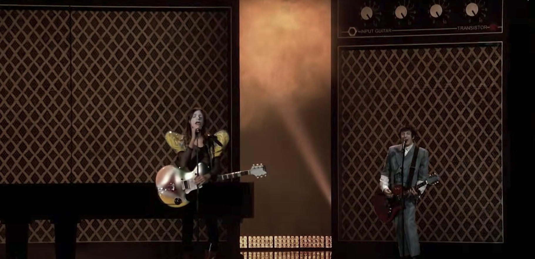 El resultado de la actuación fuer una curiosa mezcla entre lo teatral y glam de los 70 con esos amplis gigantescos con rejilla estilo Vox y el vestuario del otro guitarrista, más alineado con la estética mod más propia de los 60.