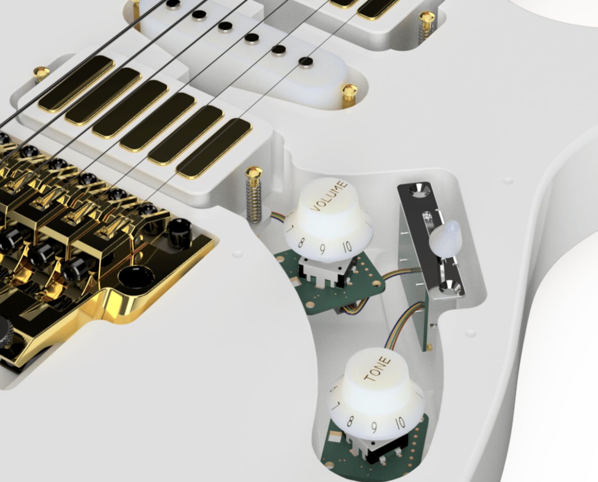 El caso es que si estamos tocando y no queremos arruinar el momento teniendo que dirgirnos al smartphone, Neura Coil también tiene controles físicos que van en la propia guitarra: los potenciómetros pueden modular cosas como controlar la ganancia o el fuzz de las cuerdas seleccionadas, activar o desactivar recortes de frecuencias o cambiar de preset con el selector de 5 posiciones.