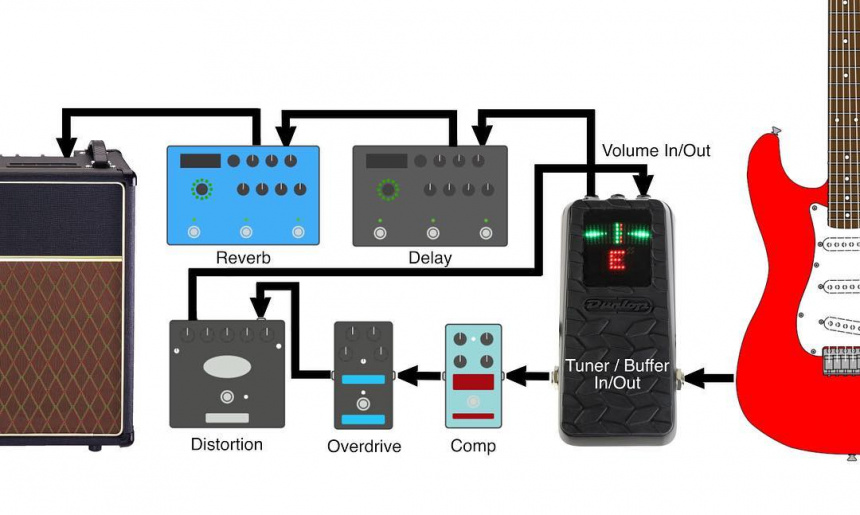 El Dunlop Mini Volume Tuner Mod también cuenta con entradas y salidas individuales para volumen y afinador, pero además incluye un circuito de Buffer y un interruptor de on/off para el afinador.