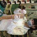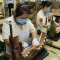 Tenemos orden de no hablar con los empleados y de no entorpecer su ritmo de trabajo, lo que es comprensible por razones de seguridad y ante la evidente minuciosidad de las tareas. Aún así, percibimos sonrisas y nos facilitan realizar fotografías. Sin duda algunos trabajadores (especialmente chicas) se destapan como expertos: la que perfila el contorno de las tapas de abeto y procede a su corte radial, la que toca cada traste de cada cuerda (¡menuda rapidez de digitación!), la que pinta con precisión el logo sobre la pala, o un chico de peinado extremo que realiza funciones de pulido. Por no hablar de la chica que encorda y afina…