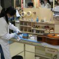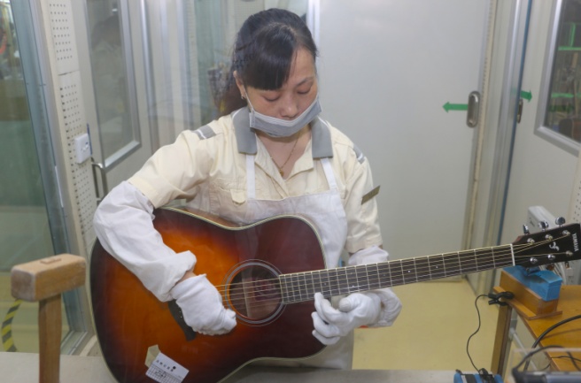 En Hangzhou, Yamaha ha establecido un sistema de fabricación manual basado en la especialización de sus operarios, dividiendo tareas, independientemente de las series de modelos que se trabajen, lo que nos recuerda al sistema de base de la factoría Tenryu en Japón. Aquí se producen las Series L, FG, A, APX, CPX, NX, CG y las nuevas Silent SLG200N/S. Con unas 276.500 unidades previstas para este ejercicio fiscal, es necesario un número de empleados considerable y en más de una ocasión, son varios los trabajadores que se dedican a un área en particular. Un solo error o proceso mal planteado puede acarrear consecuencias muy negativas, por eso se reparten 40 inspectores que supervisan constantemente las áreas fundamentales. Cualquier matiz será revisado posteriormente en el área de control de calidad. La optimización constante de tareas es parte de este sistema flexible de cubículos y zonas especializadas.