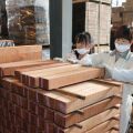 Una vez finalizado el recorrido por las dependencias de la planta superior de la nave, nuestro guía nos lleva fuera del recinto para enseñarnos cómo se almacena la madera clasificada. A primera vista no damos crédito, aunque no estamos acostumbrados a visitar fábricas todos los días, está claro que la cantidad de materia prima almacenada es brutal. A lo largo y ancho de esta nave exterior se apilan columnas de madera en bloques perfectamente alineados, de manera casi obsesiva. Cada montaña presenta un cartel con su origen, naturaleza y diagnóstico, expresado en días necesarios para completar su proceso de secado.