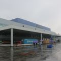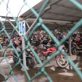 Antes de adentrarnos en la nave, nos ceden unos paraguas corporativos —ya que está cayendo una intensa lluvia, muy típica en esta época— y de camino vemos un par de canastas de baloncesto —nos confirman que es uno de los pasatiempos favoritos aquí— y el parking exterior, con más de 600 motocicletas aparcadas.