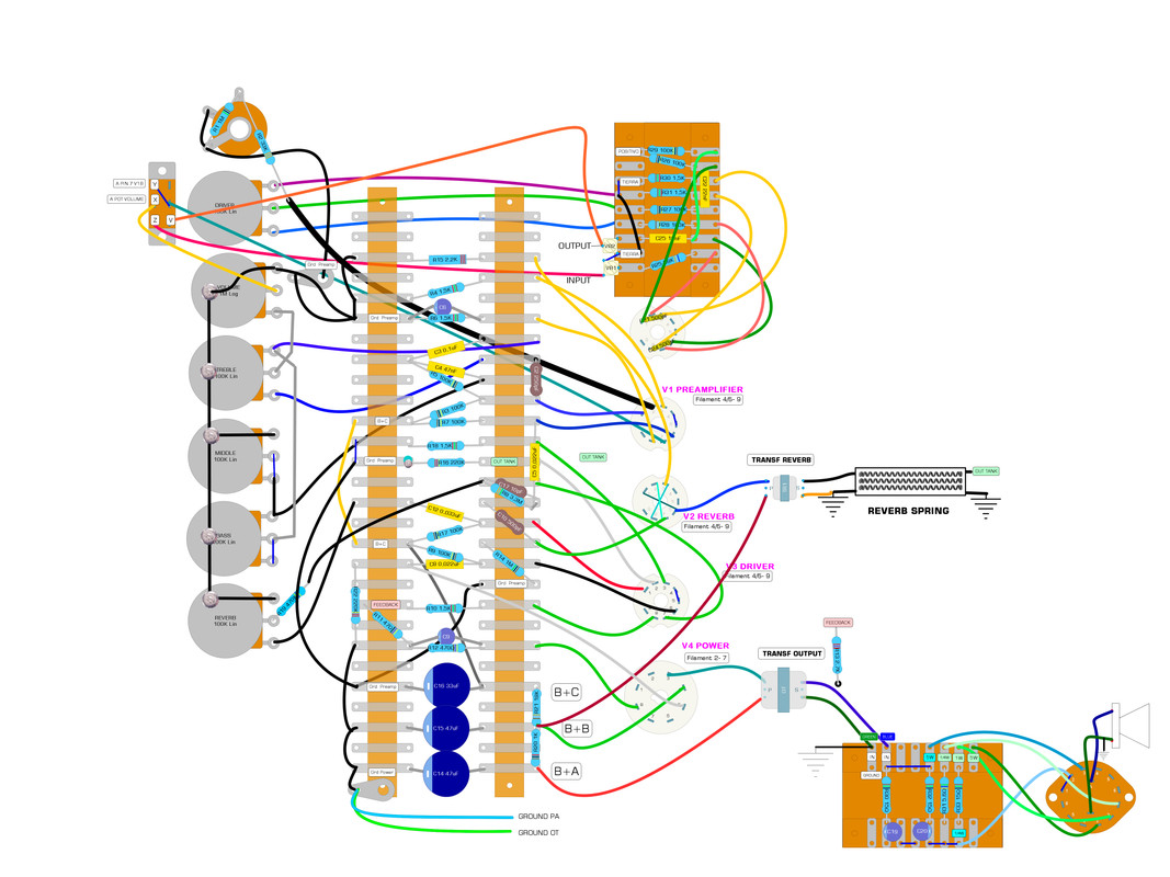 Como puedes ver es muy simple, obtienes 3 tensiones distintas A+A (para etapa final) A+B (para etapa media y driver de la reverb) y A+C (para preamplificador y reverb)