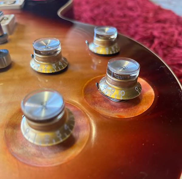 Otras modificaciones menores han sido la sustitución de la cejuela de hueso por una de Corian, reemplazo de las pastillas por unas Seymour Duncan ‘59 en puente y Jazz mástil con potenciómetros Push-Push en los controles de tono para dividir bobinas, un puente con selletas de rodillo, y una lamina transparente en la parte trasera para evitar rallarla con la hebilla del cinturón, no sea que pierda valor.