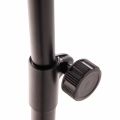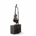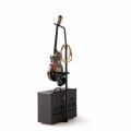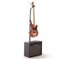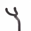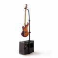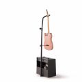 El soporte diseñado por David viene a ser una columna de altura regulable para poderla adaptar a guitarras y bajos que tiene un pie en forma de V, pensado para colocarlo bajo la pantalla de nuestro ampli. La pinza que sujeta la guitarra por la pala puede girar para adaptarse a diferentes diseños de instrumento, y la barra principal tiene un tope acolchado para frenar el instrumento.