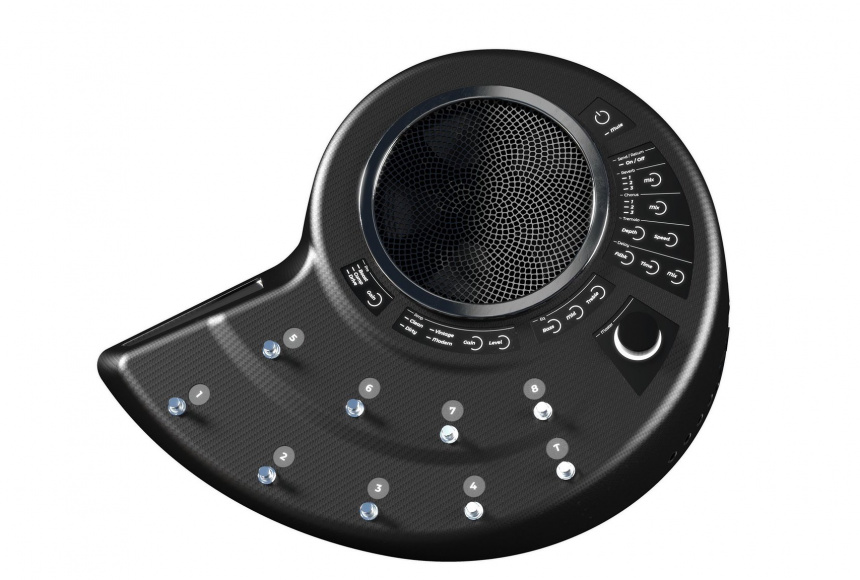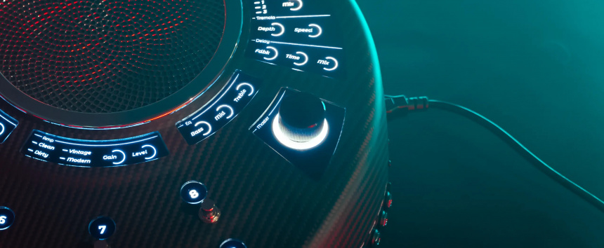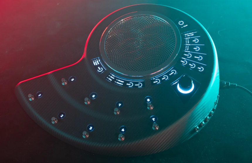 Este concepto de amplificador todo-en-uno con efectos y altavoz integrado es obra de la startup eslovena Amonito. Un nombre que hace referencia a las amonitas y con un diseño inspirado en estos abundantes fósiles de caracolas.