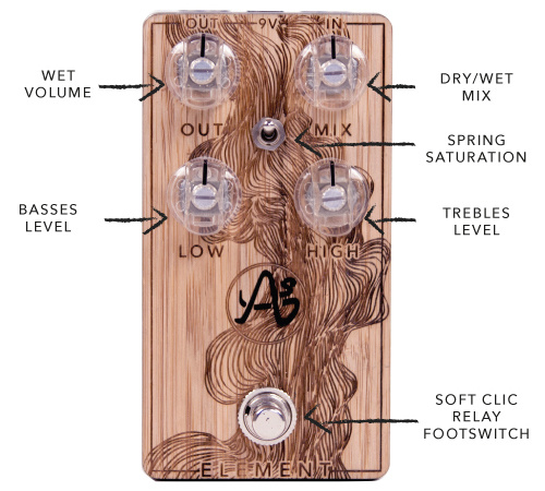 Como todos los pedales de Anasound, Element está fabricado a mano en Francia, tiene paneles grabados con laser, cuenta con conmutación True Bypass con relé, y puede ser alimentado con una fuente estándar de 9V.