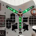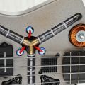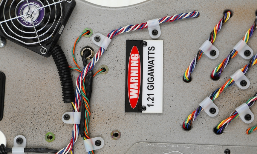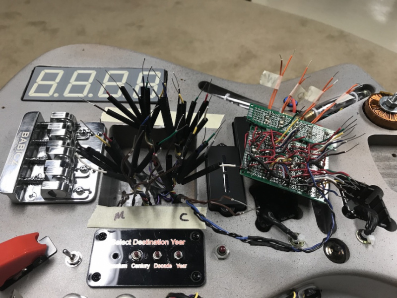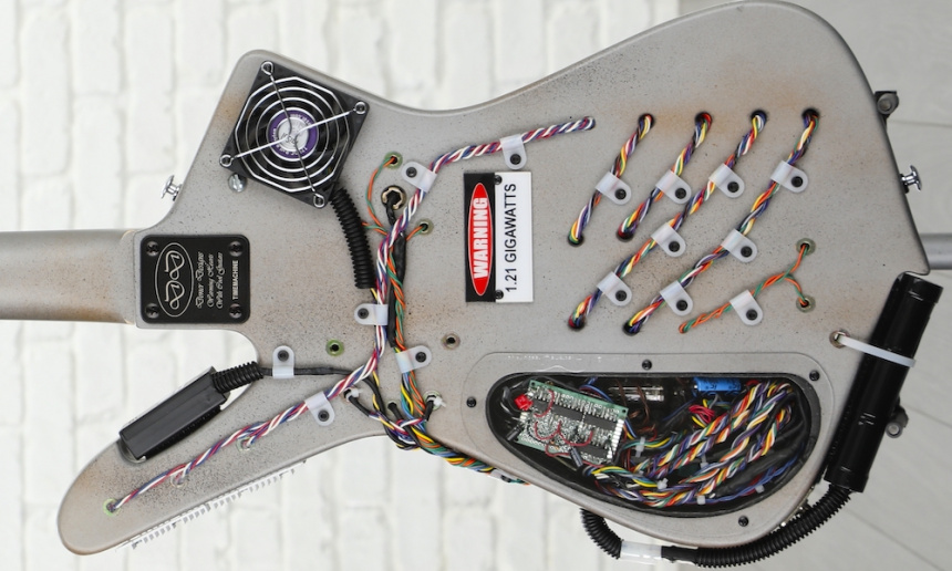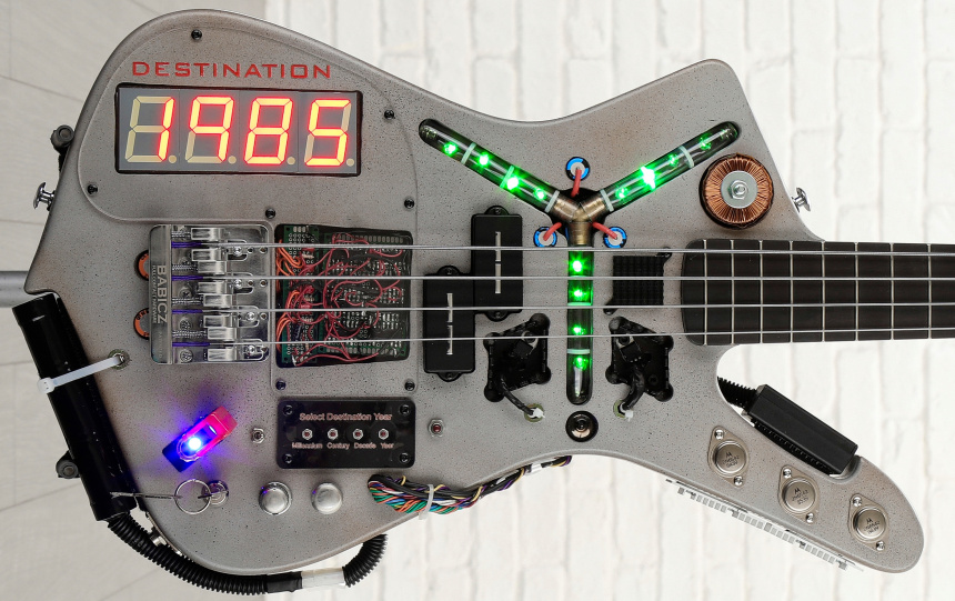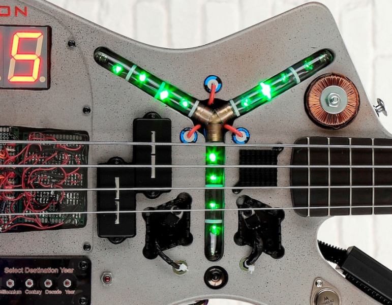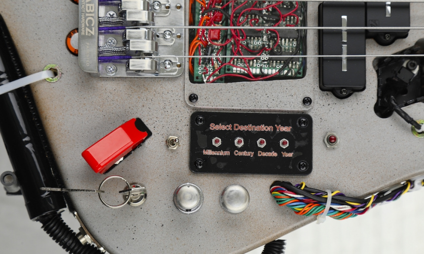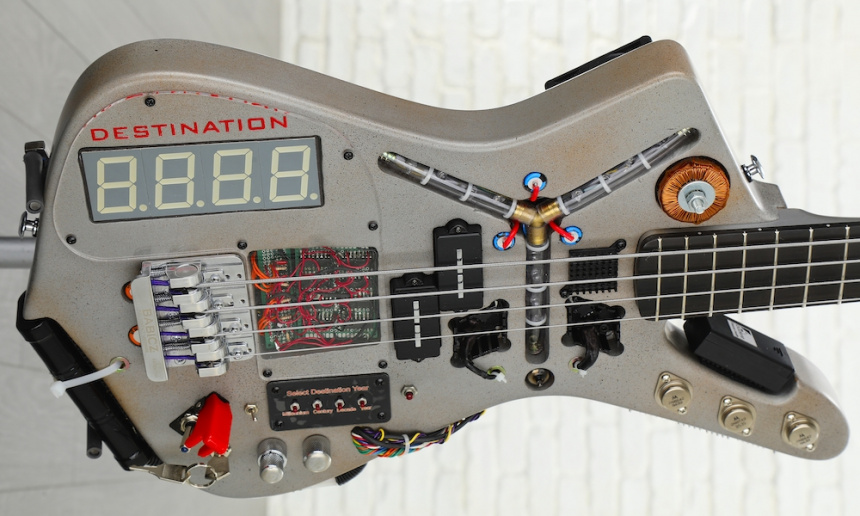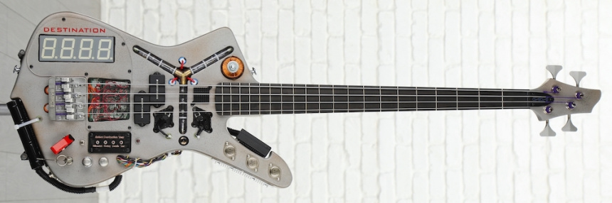 El Time Machine Bass está hecho sobre la base de un cuerpo de Aliso estilo Ibanez Iceman de Warmoth, en el que pacientemente han ido incorporando los elementos icónicos que formaban parte de la máquina del tiempo con forma de coche DeLorean inventado por Doc Brown (Christopher Lloyd). Entre ellos cuenta con un Condensador de Fluzo que parpadea o puede permanecer siempre encendido, un display de 4 cifras para poder programar la fecha de destino del viaje en el tiempo –podemos ir del año 0000 al 9999 siempre que consigamos una energía de 1.21 Gigavatios–, un conmutador de encendido estilo militar para la iluminación, o la llave de contacto para encender el sistema de audio del bajo, además de todo el complejo cableado.