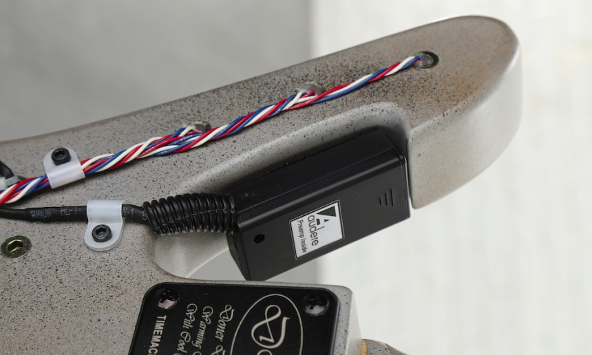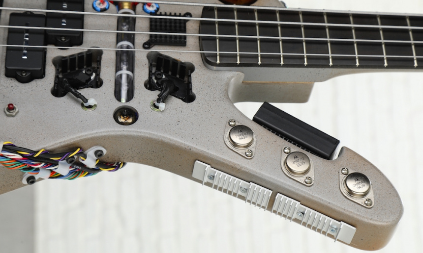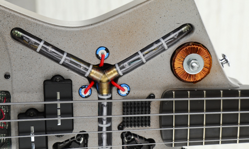 La iluminación del Condensador de Fluzo, el conmutador de encendido, y el display, funcionan mediante una batería recargable NiMH de 7.2 volt con un circuito totalmente independiente de la electrónica activa del bajo que se alimenta con una pila de 9 V alojada en una caja exterior. Por supuesto se trata de un instrumento totalmente funcional que podéis ver en acción de forma breve en este vídeo.
