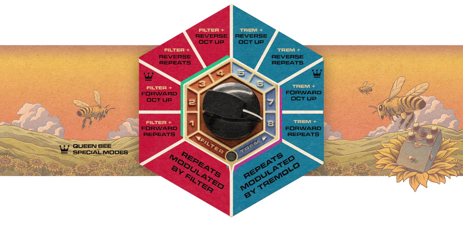 La señal se divide en cuanto entra al pedal, y antes de entrar al circuito de delay, pasa o bien por un filtro o por un tremolo a elección nuestra, y es justo después cuando podemos elegir el resto de opciones. Especialmente intrigantes son los modos Queen Mode, en estos modos, "el búfer de retardo se lee dos veces más rápido de lo que se graba, creando repeticiones de octava ascendente con ritmos musicales extraños. Gire el mando Delay Time más allá de la mitad y las cosas comenzarán a mezclarse entre la señal original y la capa de octava. Es extraño, interactivo y, sinceramente, se entiende mejor simplemente tocándolo".