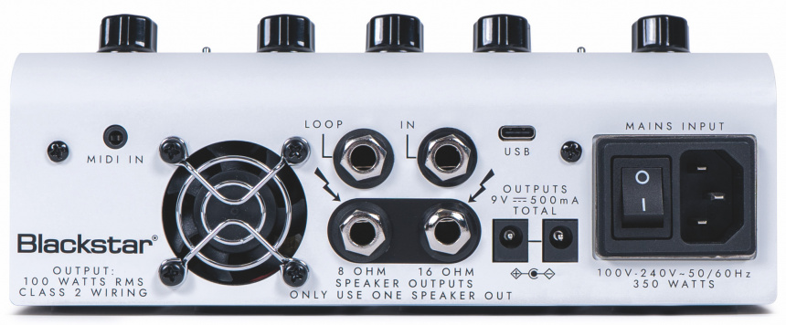 Gracias a un buen arsenal de conexiones, el Amped 1 llega bien preparado para integrarse en nuestra pedalera o ser usado como interfaz en nuestro DAW. En su panel trasero cuenta con salidas de altavoz de 8 y 16Ω; bucle de efectos configurable serie/paralelo; MIDI In; un par de salidas de 9V para alimentar otros pedales, y puerto USB-C para editar en profundidad o grabar en nuestro ordenador.