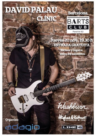 El próximo jueves 20 de noviembre a las 19:30, David Palau, de la mano de Adagio, presentará en la Sala Barts Club de Barcelona (Avinguda del Paraŀlel, 62) su nueva guitarra Washburn Parallaxe signature. También nos hablará de gran parte del equipo que lleva actualmente, como el GrandMeister de Hughes & Kettner y la pedalera POD-HD500X de Line 6. Hay previstos regalos y sorteos de vales descuento de compra.