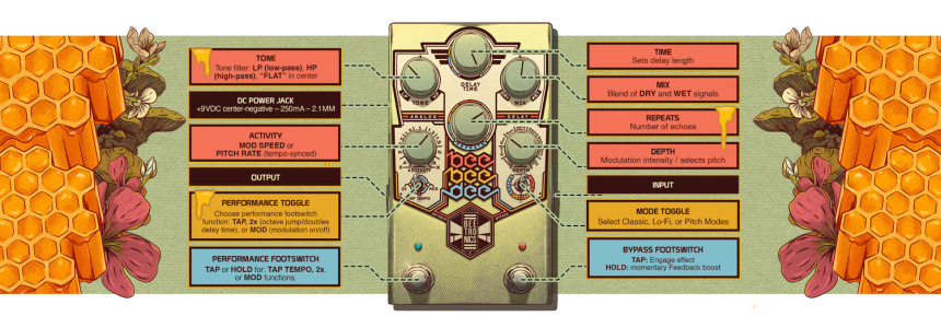 Los chicos de la abejita de Beetronics están sobre todo especializados en pedales de fuzz, que destacan por ofrecer algo extra que se sale de los circuitos tradicionales para estimular la versatilidad y creatividad. Y aunque también tienen algunos efectos de modulación, este nuevo Bee Bee Dee es su estreno con los efectos de delay.