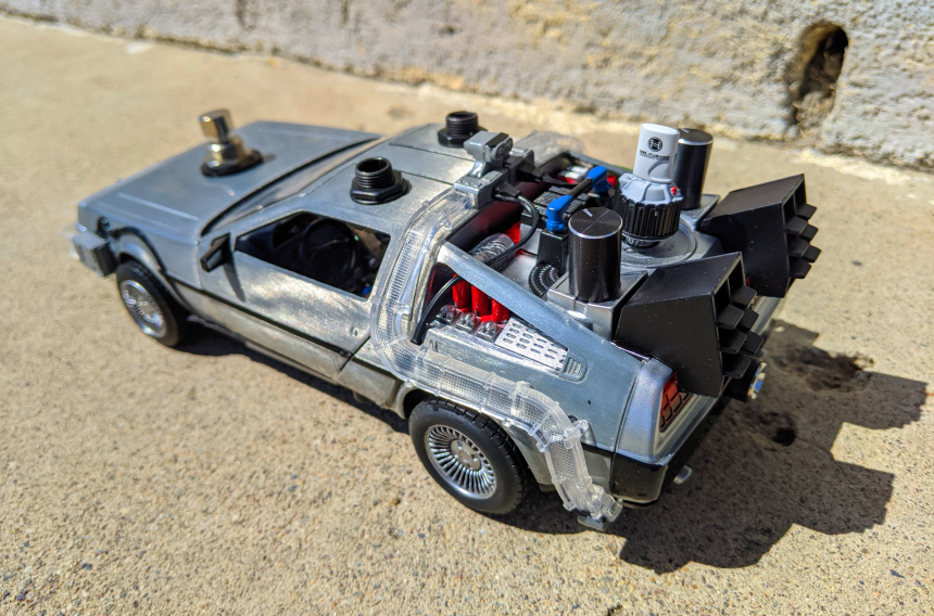 Una compañía especializada en pedales de efecto embutidos en vehículos famosos con temática Sci-Fi como el Batmovil, la furgoneta del Equipo A, la ambulancia de los Cazafantasmas, o este Delayrean encajado en una réplica a escala 1:32 del DeLorean DMC-12 modificado que emplea como máquina del tiempo el científico loco Doc Brown (Christopher Lloyd), y que acaba conduciendo al pasado de forma accidental el adolescente Marty McFly encarnado por el actor Michael J. Fox.