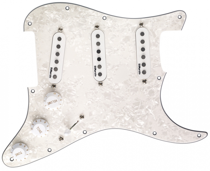 Las pastillas de esas Strat con el mismo tipo de cableado y controles, son las que ahora pone a la venta DiMarzio montadas en el Richie Kotzen Strat Replacement Pickguard, un golpeador con 3 single-coil de media ganancia y bobinado invertido en la pastilla central para tener cancelación de ruido en las posiciones 2 y cuatro del selector, ya listo para instalar sin soldaduras en cualquier Strato con 11 agujeros.