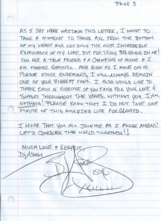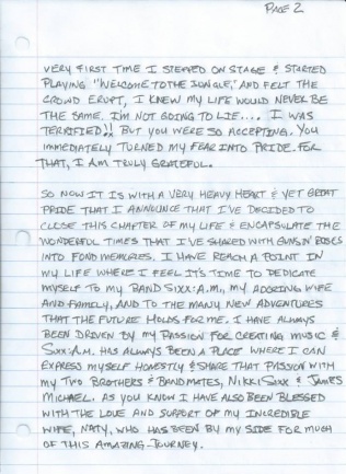 DJ Ashba entre otras cosas, explica que tiene ganas de dedicarse a su otra banda, Sixx A.M -formada junto a su amigo Nikki Sixx-, su esposa y su familia. También ha tenido ingentes palabras de agradecimiento a Axl Rose del que ha dicho entre otras cosas lo siguiente: "Mientras estoy aquí sentado escribiendo esta carta, quiero tomar un momento para agradecer a Axl desde el fondo de mi corazón no sólo la experiencia más increíble de mi vida, también por creer realmente en mí. Eres un verdadero amigo y un campeón y estoy eternamente agradecido. Y aunque decidí perseguir otras empresas, siempre seguiré siendo uno de sus mayores fans.".