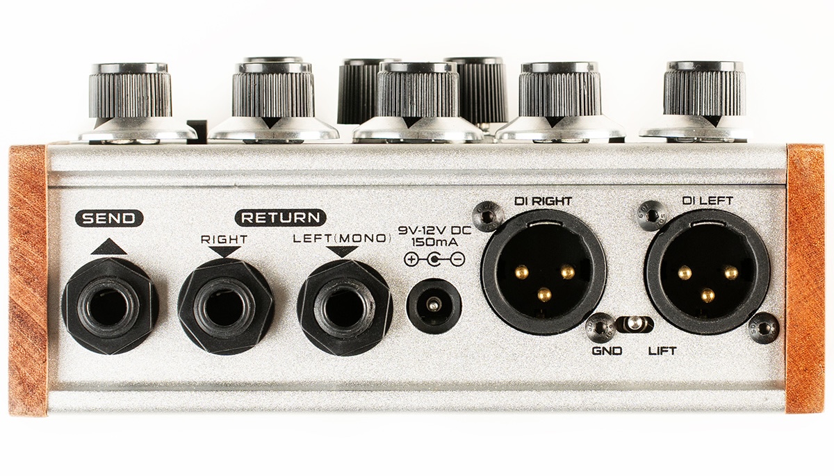 Como ya es habitual en DSM & Humboldt, el espacio está aprovechado al milímetro. En la parte trasera encontramos las salidas balanceadas XLR, la entrada de alimentación 9-12 V DC 150 mA, y el envío y retorno del bucle de efectos estéreo.