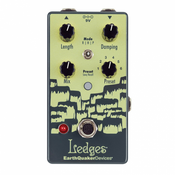 El nuevo Earthquaker Ledges es una reverberación con tres modos, Room, Hall y Plate, que podemos seleccionar mediante el switch central. De todas ellas podemos variar tres parámetros sencillos: Length, Damping y Mix. Con el primero ajustamos el "tamaño" del espacio que causa la reverberación, con el segundo limamos los agudos del efecto y con el tercero, variamos la relación de volumen con respecto a la señal sin efecto.