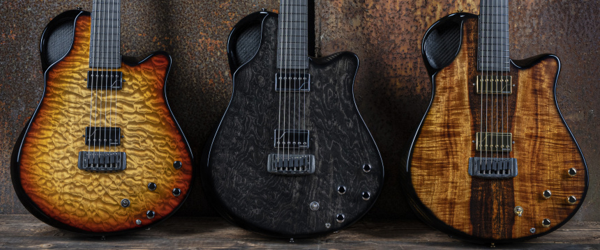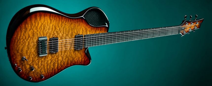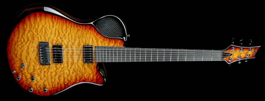 La última propuesta de Emerald se llama Virtuo, y es una versátil electro-acústica con su conocido diseño de cuerpo y mástil de una única pieza de fibra de carbono, con la boca en la esquina superior para proyectar el sonido hacia el intérprete, y una tapa (Veneer) a elegir entre una amplia variedad de acabados sólidos y translucidos, y maderas como arce ojo de pájaro o flameado, cocobolo, padauk, koa, ébano de macassar, palorrosa, nogal, etc.