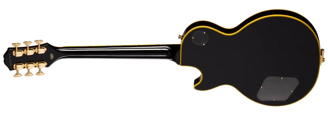 La Epiphone Joe Bonamassa 1959 Les Paul Custom tiene un cuerpo de caoba maciza con un acabado Antique Ebony, y un binding multicapa envejecido en la parte superior y posterior, acentuando el aspecto vintage.