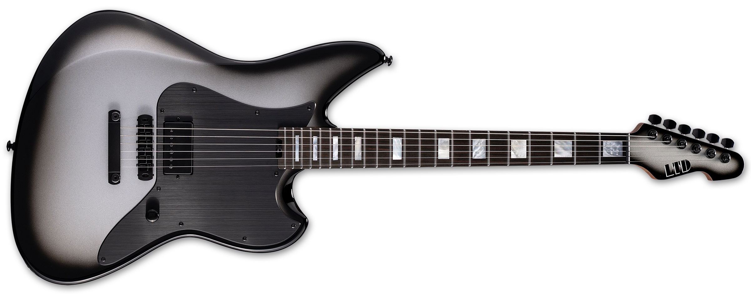 Una guitarra de filosofía minimalista basada en el modelo XJ estilo Jazzmaster de ESP/LTD, que llega con un cuerpo estilo offset de caoba en acabado Silver Sunburst.